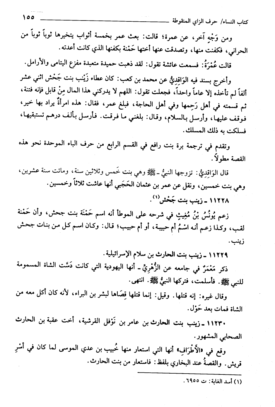 وأخرج بسند فيه الواقديّ عن محمد بن كعب: كان عطاء زينب بنت جحش اثني عشر ألفا لم تأخذه إلا عاما واحدا، فجعلت تقول: اللَّهمّ لا يدركني هذا المال من قابل فإنه فتنة، ثم قسمته في أهل رحمها وفي أهل الحاجة، فبلغ عمر، فقال: هذه امرأة يراد بها خير، فوقف عليها، وأرسل بالسلام، وقال: بلغني ما فرقت. فأرسل بألف درهم تستبقيها، فسلكت به ذلك المسلك.