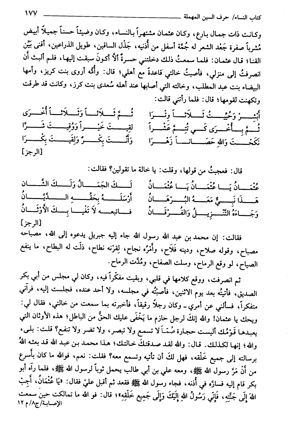 ويحك يا عثمان! واللَّه إنك لرجل حازم ما يخفى عليك الحقّ من الباطل، هذه الأوثان التي يعبدها قومك أليست حجارة صمّا لا تسمع ولا تبصر، ولا تضر ولا تنفع؟ قلت: بلى، واللَّه، إنها لكذلك. قال: واللَّه لقد صدقتك خالتك، هذا محمد بن عبد اللَّه قد بعثه اللَّه برسالته إلى جميع خلقه، فهل لك أن تأتيه وتسمع معه؟ فقلت: نعم، فو اللَّه ما كان بأسرع من أن مرّ رسول اللَّه صلّى اللَّه عليه وسلّم، ومعه علي بن أبي طالب يحمل ثوبا لرسول اللَّه صلّى اللَّه عليه وسلّم، فلما رآه أبو بكر قام إليه فسارّه في أذنه، فجاء رسول اللَّه صلّى اللَّه عليه وسلّم فقعد ثم أقبل عليّ فقال: «يا عثمان، أجب اللَّه إلى جنّته، فإنّي رسول اللَّه إليك وإلى جميع خلقه» ،