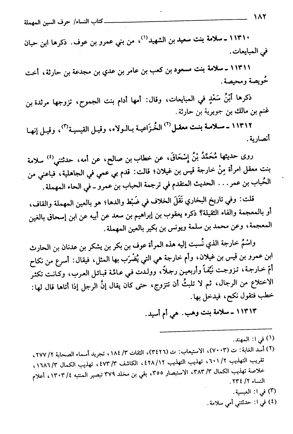 (٢) أسد الغابة ت (٧٠٠٣) ، الاستيعاب: ت (٣٤٢٦) ، الثقات ٣/ ١٨٤، تجريد أسماء الصحابة ٢/ ٢٧٧، تقريب التهذيب ٢/ ٦٠١، تهذيب التهذيب ١٢/ ٤٢٨، الكاشف ٣/ ٤٧٣، تهذيب الكمال ٣/ ١٦٨٦، خلاصة تهذيب الكمال ٣/ ٣٨٣، الاستبصار ٣٥٥، بقي بن مخلد ٣٧٩ تبصير المنتبه ٤/ ١٣٠٣، أعلام النساء ٢/ ٢٣٤.