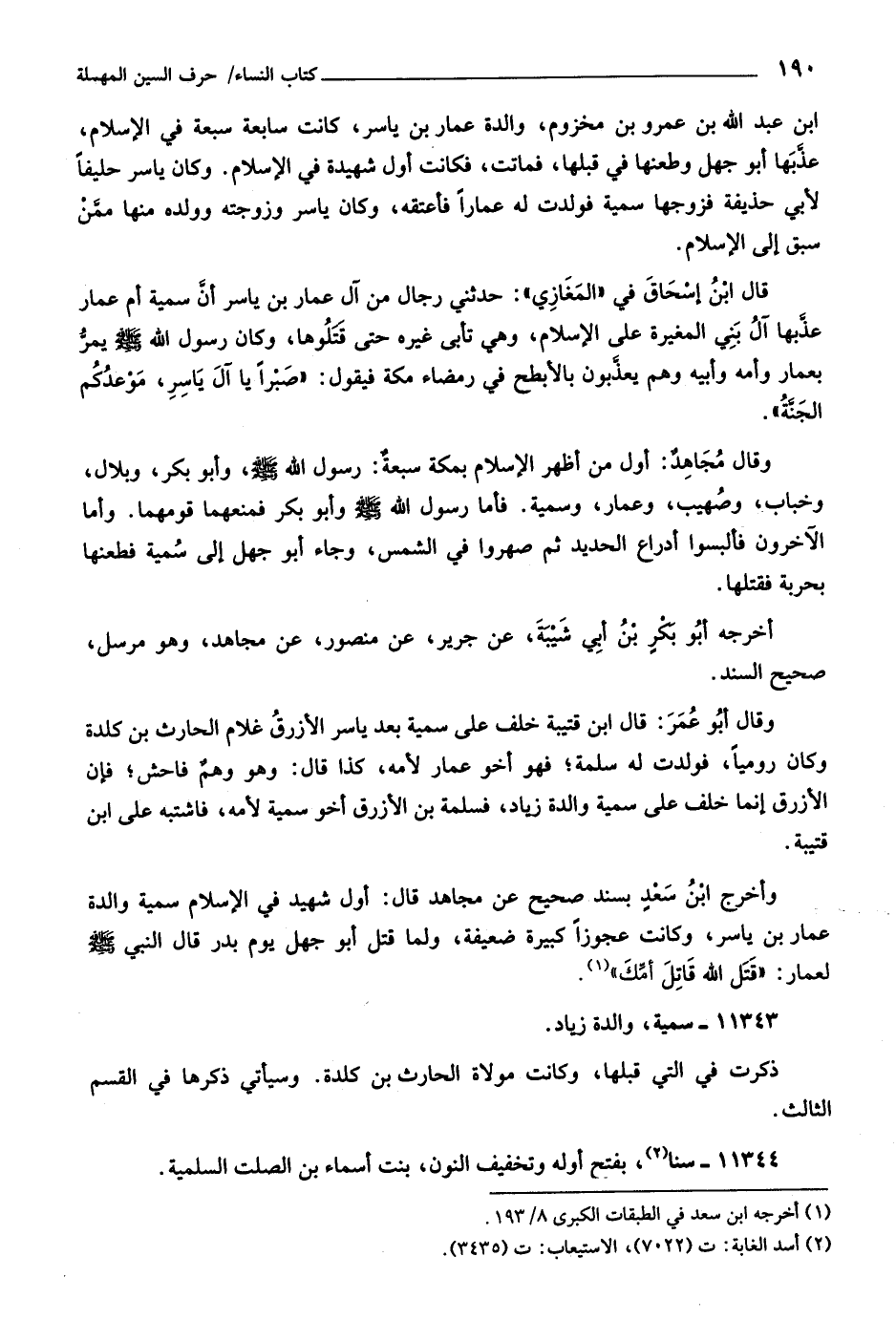 وأخرج ابن سعد بسند صحيح عن مجاهد قال: أول شهيد في الإسلام سمية والدة عمار بن ياسر، وكانت عجوزا كبيرة ضعيفة، ولما قتل أبو جهل يوم بدر قال النبيّ صلّى اللَّه عليه وسلّم لعمار: «قتل اللَّه قاتل أمّك» «١» .