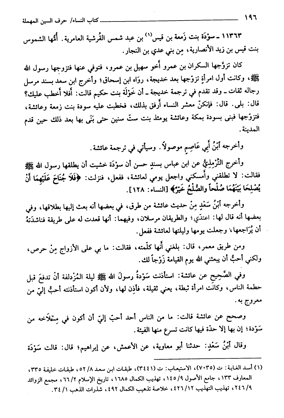 كان تزوّجها السكران بن عمرو أخو سهيل بن عمرو، فتوفي عنها فتزوجها رسول اللَّه صلّى اللَّه عليه وسلّم، وكانت أول امرأة تزوّجها بعد خديجة، رواه ابن إسحاق، وأخرج ابن سعد بسند مرسل رجاله ثقات- وقد تقدم في ترجمة خديجة- أن خولة بنت حكيم قالت: أفلا أخطب عليك؟