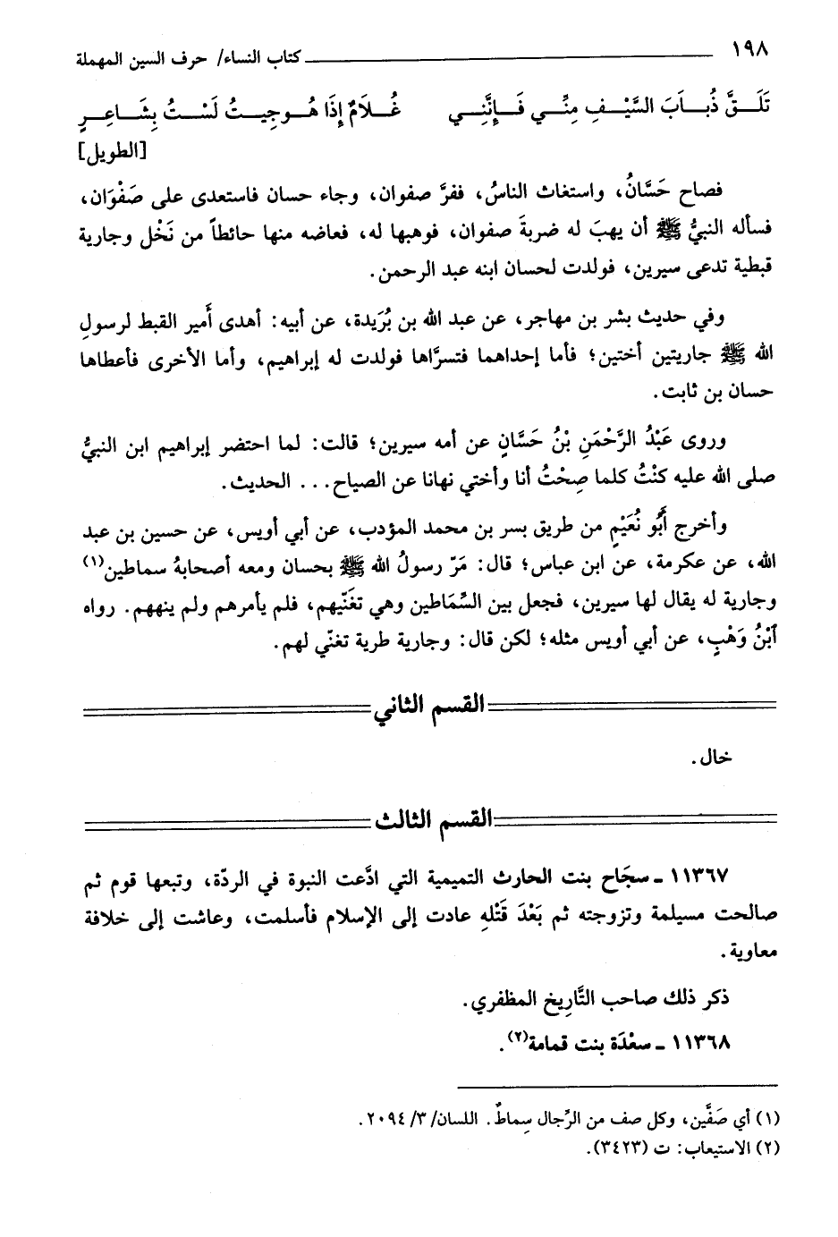 [الطويل] فصاح حسّان، واستغاث الناس، ففرّ صفوان، وجاء حسان فاستعدى على صفوان، فسأله النبيّ صلّى اللَّه عليه وسلّم أن يهب له ضربة صفوان، فوهبها له، فعاضه منها حائطا من نخل وجارية قبطية تدعى سيرين، فولدت لحسان ابنه عبد الرحمن.