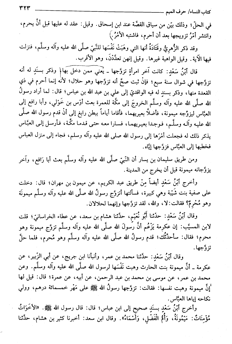 وقال ابن سعد: حدّثنا أبو نعيم، حدّثنا هشام بن سعد، عن عطاء الخراسانيّ، قلت لابن المسيّب: إن عكرمة يزعم أنّ رسول اللَّه صلّى اللَّه عليه وآله وسلّم تزوّج ميمونة وهو محرم، فقال: سأحدّثك، قدم رسول اللَّه صلّى اللَّه عليه وآله وسلّم وهو محرم، فلما حلّ تزوّجها.