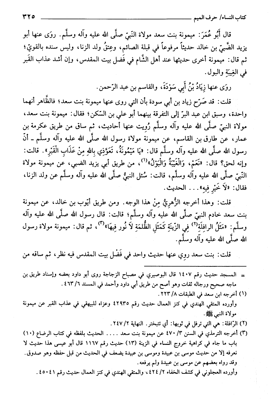 قال أبو عمر: ميمونة بنت سعد مولاة النّبيّ صلّى اللَّه عليه وآله وسلّم. روى عنها أبو يزيد الضّبيّ بن خالد حديثا مرفوعا في قبلة الصائم، وعتق ولد الزنا، وليس سنده بالقويّ، ثم قال: ميمونة أخرى حديثها عند أهل الشّام في فضل بيت المقدس، وإن أشد عذاب القبر في الغيبة والبول.