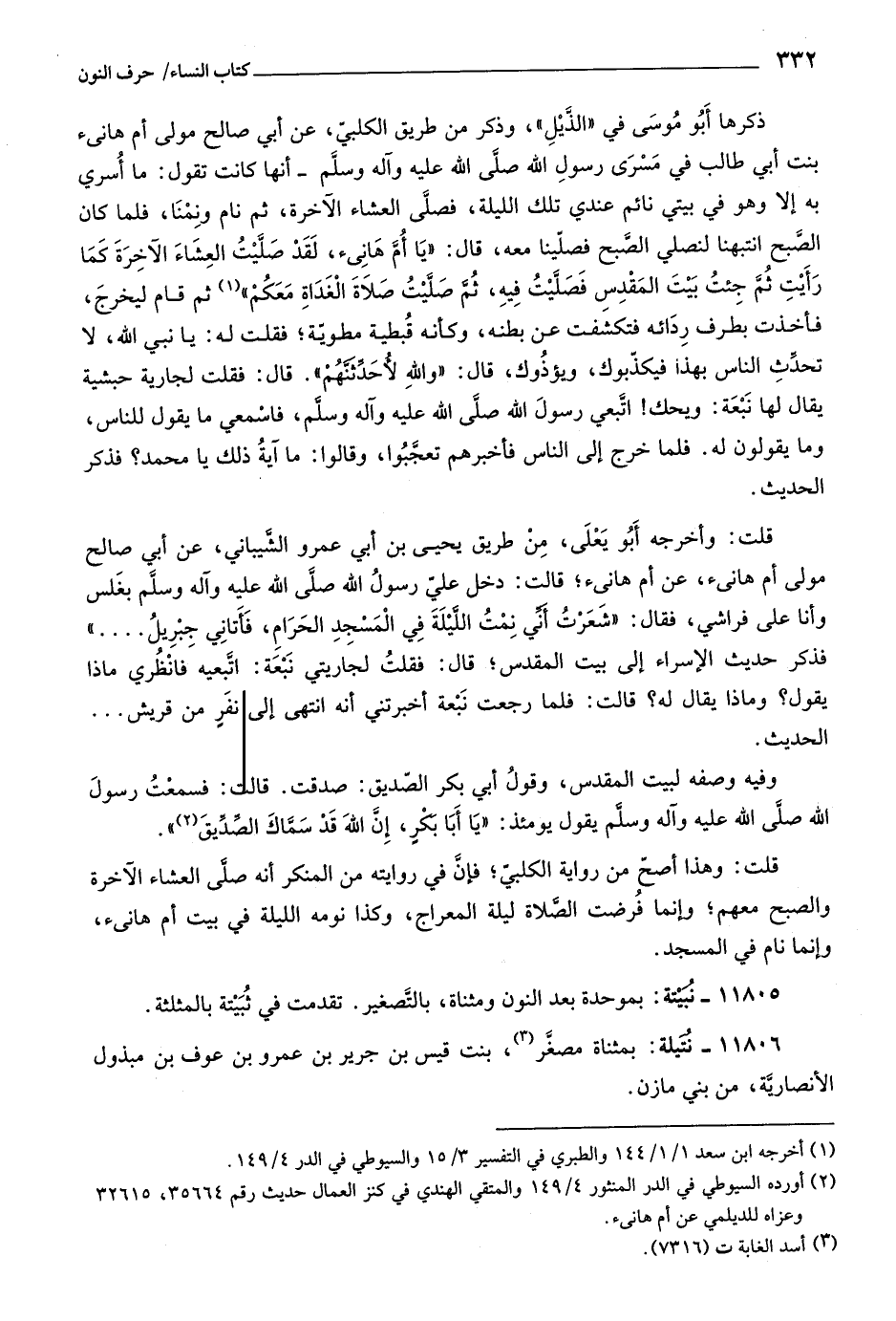 فذكر حديث الإسراء إلى بيت المقدس، قال: فقلت لجاريتي نبعة: اتّبعيه فانظري ماذا يقول؟ وماذا يقال له؟ قالت: فلما رجعت نبعة أخبرتني أنه انتهى إلى نفر من قريش ...