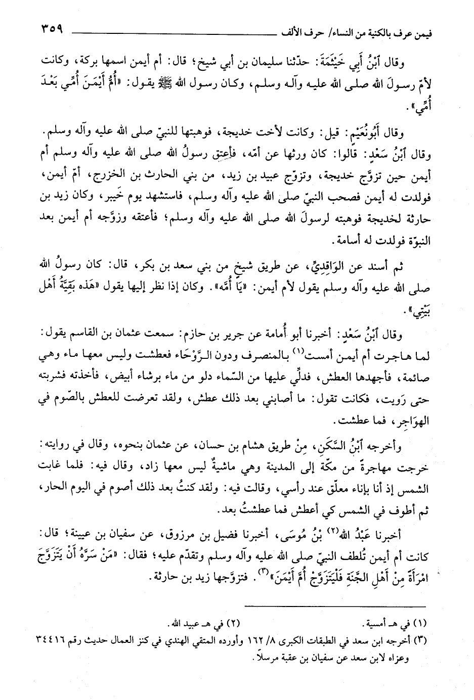 ثم أسند عن الواقديّ، عن طريق شيخ من بني سعد بن بكر، قال: كان رسول اللَّه صلّى اللَّه عليه وآله وسلّم يقول لأم أيمن: «يا أمّه» . وكان إذا نظر إليها يقول «هذه بقيّة أهل بيتي» .