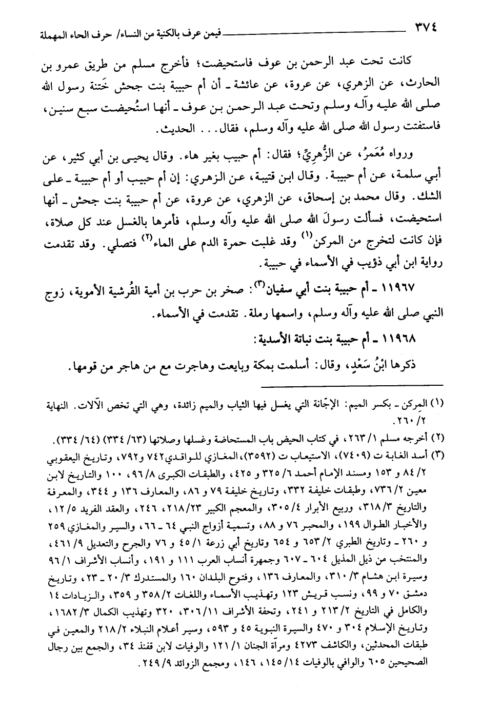 كانت تحت عبد الرحمن بن عوف فاستحيضت، فأخرج مسلم من طريق عمرو بن الحارث، عن الزهري، عن عروة، عن عائشة- أن أم حبيبة بنت جحش ختنة رسول اللَّه صلّى اللَّه عليه وآله وسلّم وتحت عبد الرحمن بن عوف- أنها استحيضت سبع سنين، فاستفتت رسول اللَّه صلّى اللَّه عليه وآله وسلم، فقال ... الحديث.