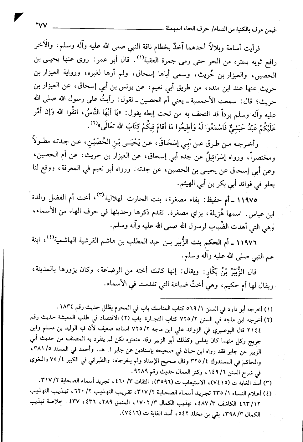 (٤) أعلام النساء ١/ ٢٣٥ تجريد أسماء الصحابة ٢/ ٣١٧، تقريب التهذيب ٢/ ٦٢٠، تهذيب التهذيب ١٢/ ٤٦٣ الكاشف ٣/ ٤٨٧، تهذيب الكمال ٣/ ١٧٠٢، المنمق ٢٨٩، ٤٣٦، ٤٣٧. خلاصة تهذيب الكمال ٣/ ٣٩٨، بقي بن مخلد ٥٤٢، أسد الغابة ت (٧٤١٦) .