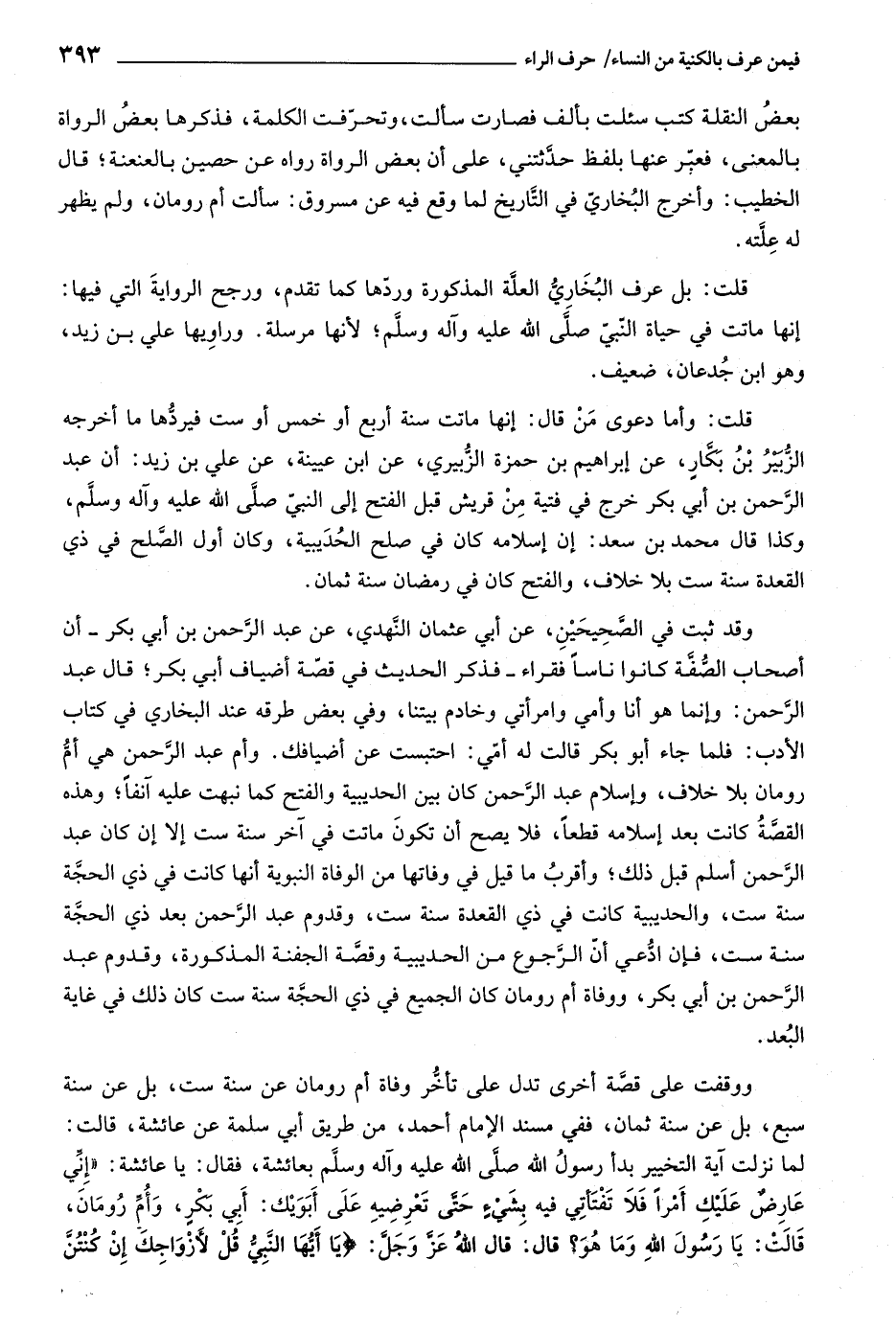 وقد ثبت في الصّحيحين، عن أبي عثمان النّهدي، عن عبد الرّحمن بن أبي بكر- أن أصحاب الصّفّة كانوا ناسا فقراء- فذكر الحديث في قصّة أضياف أبي بكر، قال عبد الرّحمن: وإنما هو أنا وأمي وامرأتي وخادم بيتنا، وفي بعض طرقه عند البخاري في كتاب الأدب: فلما جاء أبو بكر قالت له أمّي: احتبست عن أضيافك. وأم عبد الرّحمن هي أمّ رومان بلا خلاف، وإسلام عبد الرّحمن كان بين الحديبيّة والفتح كما نبهت عليه آنفا، وهذه القصّة كانت بعد إسلامه قطعا، فلا يصح أن تكون ماتت في آخر سنة ست إلا إن كان عبد الرّحمن أسلم قبل ذلك، وأقرب ما قيل في وفاتها من الوفاة النبويّة أنها كانت في ذي الحجّة سنة ست، والحديبيّة كانت في ذي القعدة سنة ست، وقدوم عبد الرّحمن بعد ذي الحجّة سنة ست، فإن ادّعي أنّ الرّجوع من الحديبيّة وقصّة الجفنة المذكورة، وقدوم عبد الرّحمن بن أبي بكر، ووفاة أم رومان كان الجميع في ذي الحجّة سنة ست كان ذلك في غاية البعد.