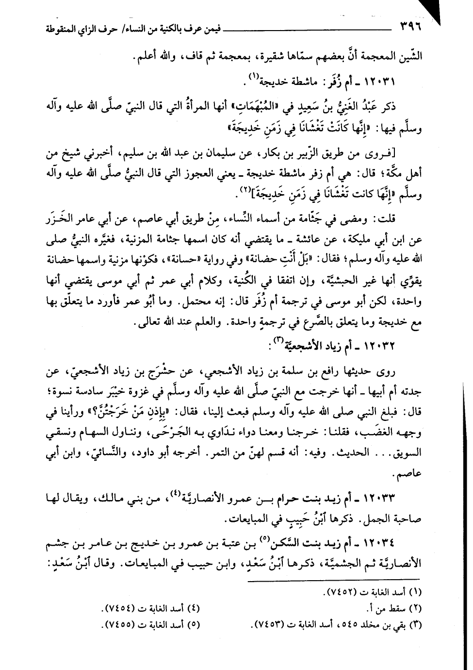 [فروى من طريق الزّبير بن بكار، عن سليمان بن عبد اللَّه بن سليم، أخبرني شيخ من أهل مكّة، قال: هي أم زفر ماشطة خديجة- يعني العجوز التي قال النبيّ صلّى اللَّه عليه وآله وسلّم «إنّها كانت تغشانا في زمن خديجة] «٢» .