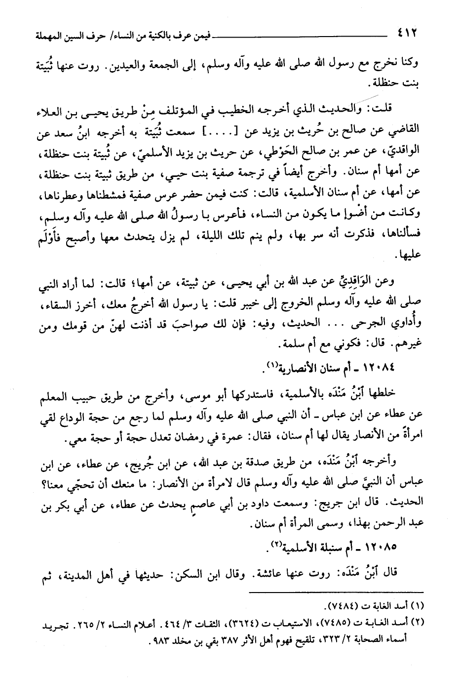 قلت: والحديث الّذي أخرجه الخطيب في المؤتلف من طريق يحيى بن العلاء القاضي عن صالح بن حريث بن يزيد عن [ ... ] سمعت ثبيتة به أخرجه ابن سعد عن الواقديّ، عن عمر بن صالح الحوطي، عن حريث بن يزيد الأسلميّ، عن ثبيتة بنت حنظلة، عن أمها أم سنان. وأخرج أيضا في ترجمة صفية بنت حيي، من طريق ثبيتة بنت حنظلة، عن أمها، عن أم سنان الأسلمية، قالت: كنت فيمن حضر عرس صفية فمشطناها وعطرناها، وكانت من أضوإ ما يكون من النساء، فأعرس بها رسول اللَّه صلّى اللَّه عليه وآله وسلّم، فسألناها، فذكرت أنه سر بها، ولم ينم تلك الليلة، لم يزل يتحدث معها وأصبح فأولم عليها.