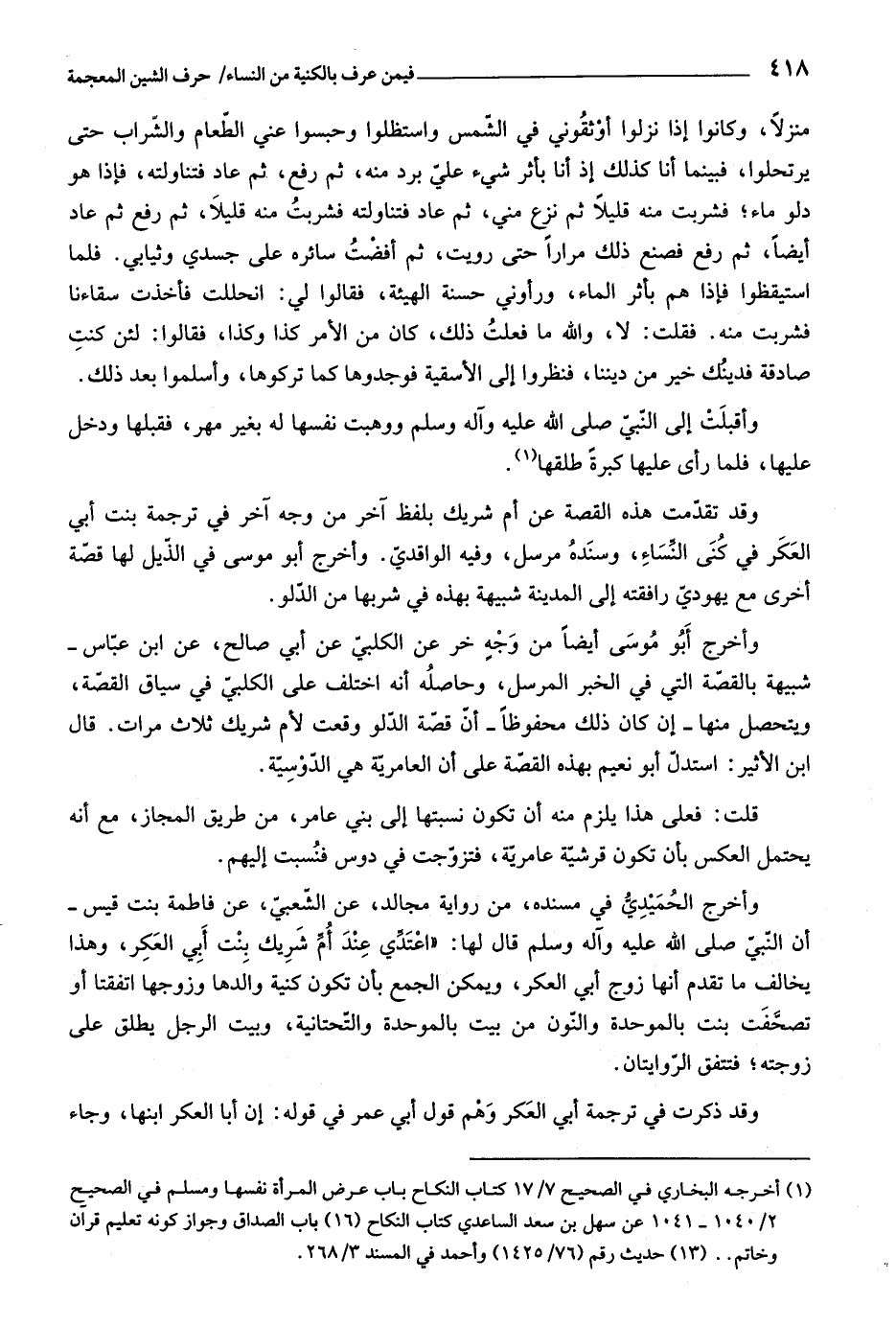 وأخرج الحميديّ في مسندة، من رواية مجالد، عن الشّعبيّ، عن فاطمة بنت قيس- أن النّبيّ صلّى اللَّه عليه وآله وسلم قال لها: «اعتدّي عند أمّ شريك بنت أبي العكر،
