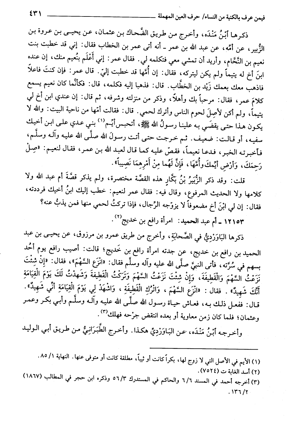 ذكرها ابن مندة، وأخرج من طريق الضّحاك بن عثمان، عن يحيى بن عروة بن الزّبير، عن أمّه، عن عبد اللَّه بن عمر- أنه أتى عمر بن الخطاب فقال: إني قد خطبت بنت نعيم بن النّحّام، وأريد أن تمشي معي فتكلمه لي. فقال عمر: إني أعلم بنعيم منك، إن عنده ابن أخ له يتيما ولم يكن ليتركه، فقال: إن أمّها قد خطبت إليّ. قال عمر: فإن كنت فاعلا فاذهب معك بعمك زيد بن الخطّاب. قال: فذهبا إليه فكلمه، قال: فكأنّما كان نعيم يسمع كلام عمر، فقال: مرحبا بك وأهلا، وذكر من منزلته وشرفه، ثم قال: إن عندي ابن أخ لي يتيما، ولم أكن لأصل لحوم الناس وأترك لحمي. قال: فقالت أمّها من ناحية البيت: واللَّه لا يكون هذا حتى يقضي به علينا رسول اللَّه صلّى اللَّه عليه وآله وسلم، أتحبس أيّم «١» بني عدي على ابن أخيك سفيه، أو قالت: ضعيف.