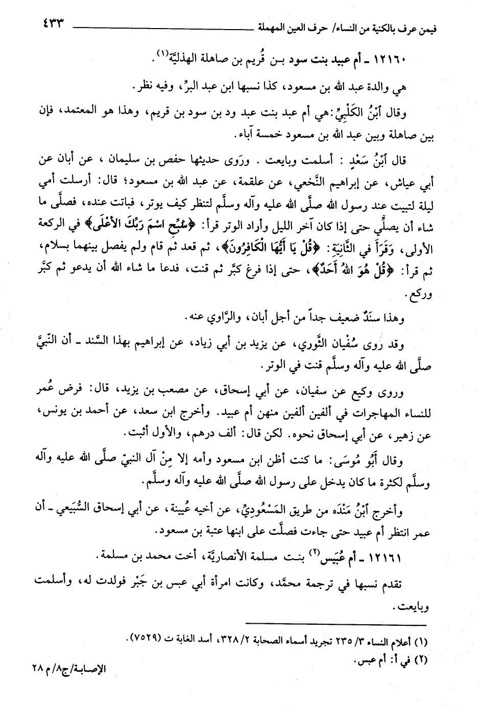وروى وكيع عن سفيان، عن أبي إسحاق، عن مصعب بن يزيد، قال: فرض عمر للنساء المهاجرات في ألفين ألفين منهن أم عبيد. وأخرج ابن سعد، عن أحمد بن يونس، عن زهير، عن أبي إسحاق نحوه. لكن قال: ألف درهم، والأول أثبت.