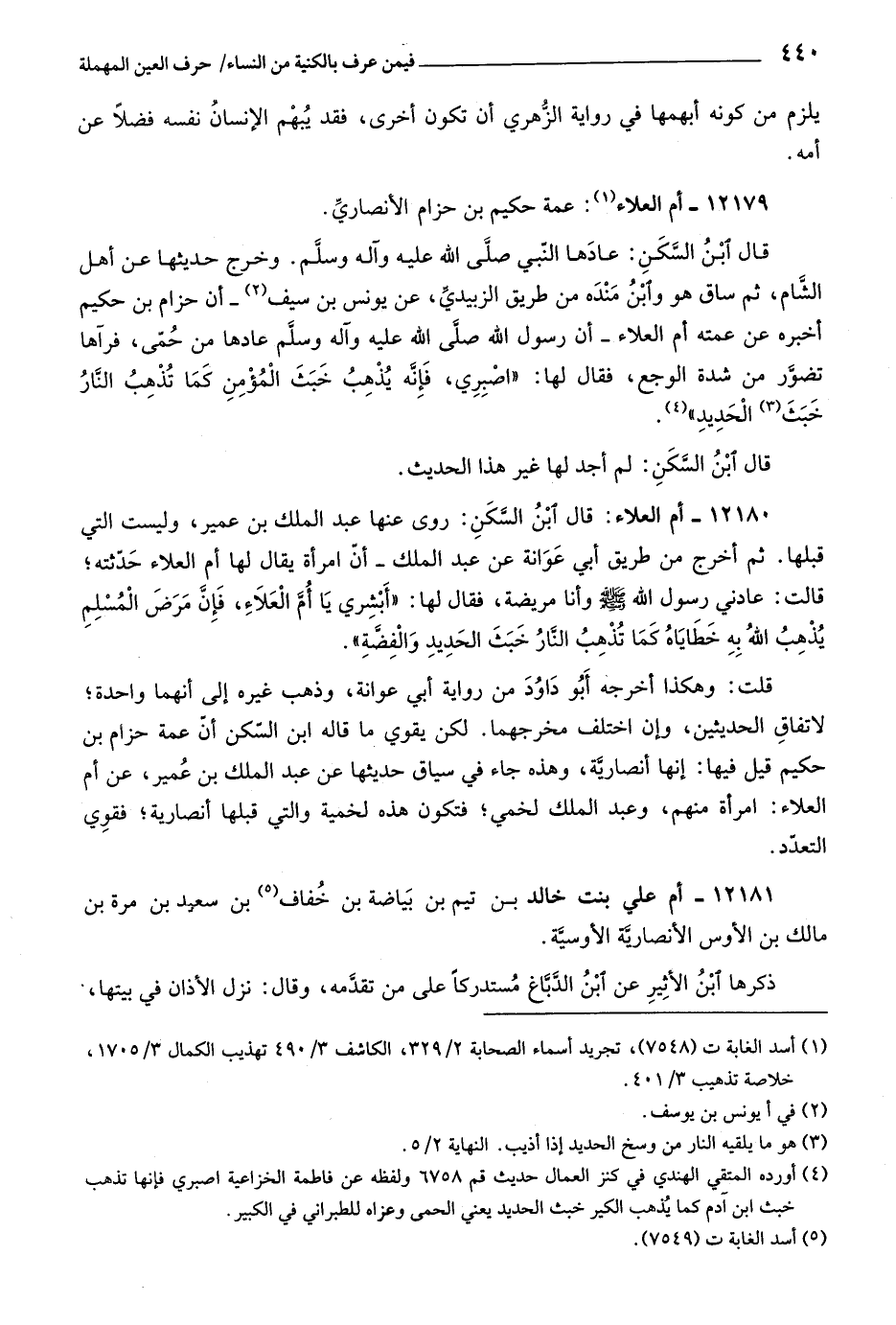 ساق هو وابن مندة من طريق الزبيديّ، عن يونس بن سيف «٢» - أن حزام بن حكيم أخبره عن عمته أم العلاء- أن رسول اللَّه صلّى اللَّه عليه وآله وسلّم عادها من حمّى، فرآها تضوّر من شدة الوجع، فقال لها: «اصبري، فإنّه يذهب خبث المؤمن كما تذهب النّار خبث «٣» الحديد» «٤» .