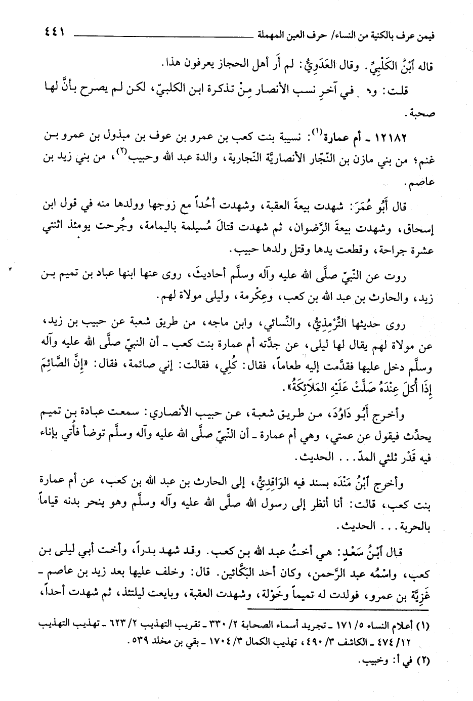 (١) أعلام النساء ٥/ ١٧١- تجريد أسماء الصحابة ٢/ ٣٣٠- تقريب التهذيب ٢/ ٦٢٣- تهذيب التهذيب ١٢/ ٤٧٤- الكاشف ٣/ ٤٩٠، تهذيب الكمال ٣/ ١٧٠٤- بقي بن مخلد ٥٣٩.