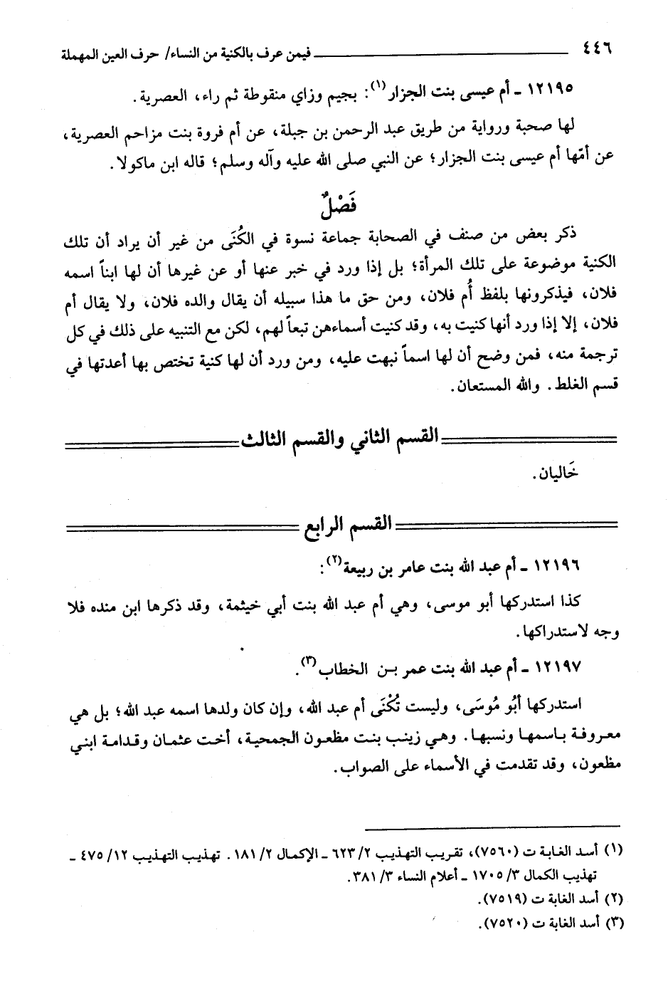 ذكر بعض من صنف في الصحابة جماعة نسوة في الكنى من غير أن يراد أن تلك الكنية موضوعة على تلك المرأة، بل إذا ورد في خبر عنها أو عن غيرها أن لها ابنا اسمه فلان، فيذكرونها بلفظ أم فلان، ومن حق ما هذا سبيله أن يقال والده فلان، ولا يقال أم فلان، إلا إذا ورد أنها كنيت به، وقد كنيت أسماءهن تبعا لهم، لكن مع التنبيه على ذلك في كل ترجمة منه، فمن وضح أن لها اسما نبهت عليه، ومن ورد أن لها كنية تختص بها أعدتها في قسم الغلط. واللَّه المستعان.