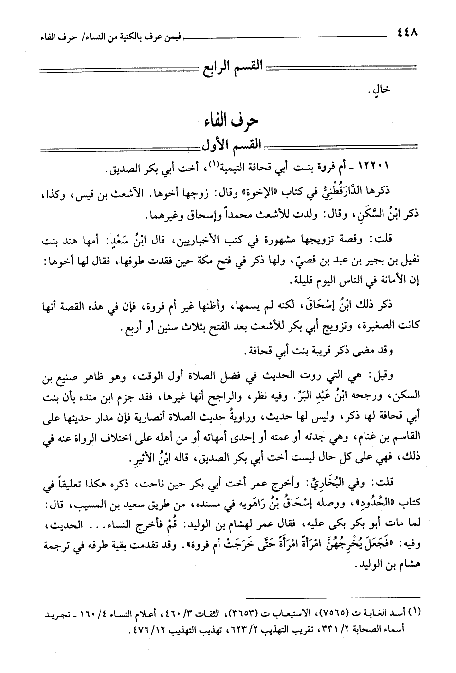 وقيل: هي التي روت الحديث في فضل الصلاة أول الوقت، وهو ظاهر صنيع بن السكن، ورجحه ابن عبد البرّ. وفيه نظر، والراجح أنها غيرها، فقد جزم ابن مندة بأن بنت أبي قحافة لها ذكر، وليس لها حديث، وراوية حديث الصلاة أنصارية فإن مدار حديثها على القاسم بن غنام، وهي جدته أو عمته أو إحدى أمهاته أو من أهله على اختلاف الرواة عنه في ذلك، فهي على كل حال ليست أخت أبي بكر الصديق، قاله ابن الأثير.