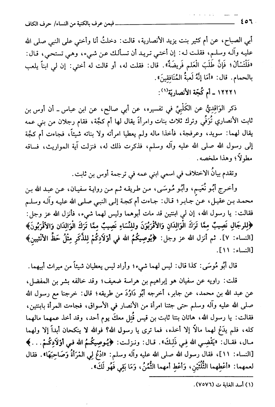 وأخرج أبو نعيم، وأبو موسى، من طريقه ثم من رواية سفيان، عن عبد اللَّه بن محمد بن عقيل، عن جابر، قال: جاءت أم كجة إلى النبي صلّى اللَّه عليه وآله وسلم فقالت: يا رسول اللَّه، إن لي ابنتين قد مات أبوهما وليس لهما شيء، فأنزل اللَّه عز وجل: