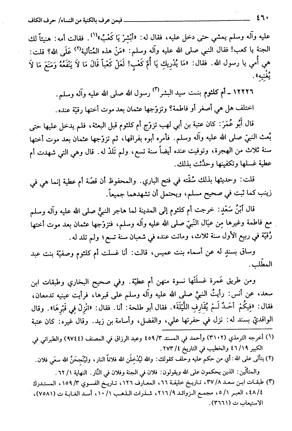 قال أبو عمر: كان عتبة بن أبي لهب تزوّج أم كلثوم قبل البعثة، فلم يدخل عليها حتى بعث النّبيّ صلّى اللَّه عليه وآله وسلم. فأمره أبوه بفراقها، ثم تزوّجها عثمان بعد موت أختها سنة ثلاث من الهجرة، وتوفيت عنده أيضا سنة تسع، ولم تلد له. قال وهي التي شهدت أم عطية غسلها وتكفينها وحدّثت بذلك.