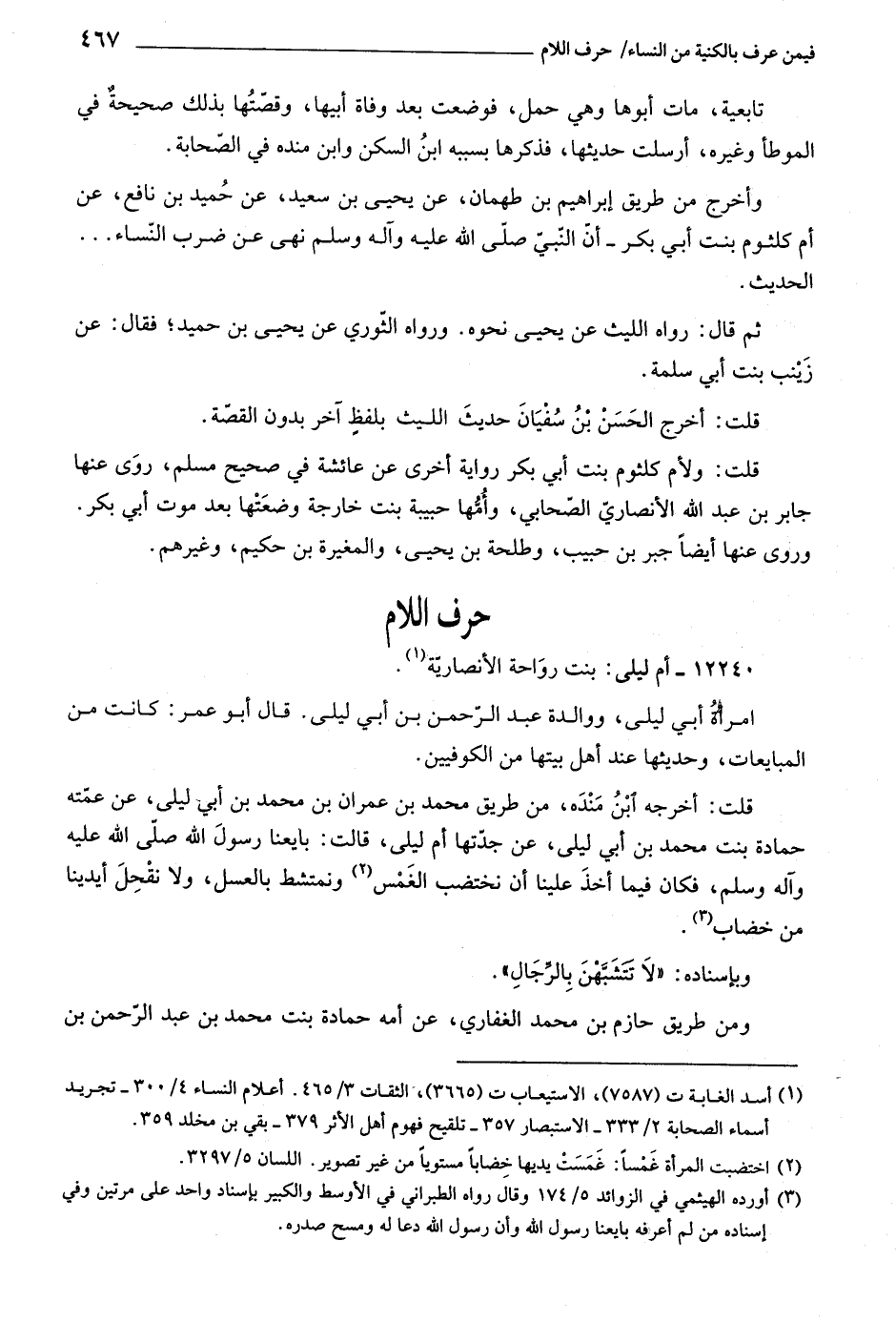 أخرجه ابن مندة، من طريق محمد بن عمران بن محمد بن أبي ليلى، عن عمّته حمادة بنت محمد بن أبي ليلى، عن جدّتها أم ليلى، قالت: بايعنا رسول اللَّه صلّى اللَّه عليه وآله وسلم، فكان فيما أخذ علينا أن نختضب الغمس «٢» ونمتشط بالعسل، ولا نقحل أيدينا من خضاب «٣» .