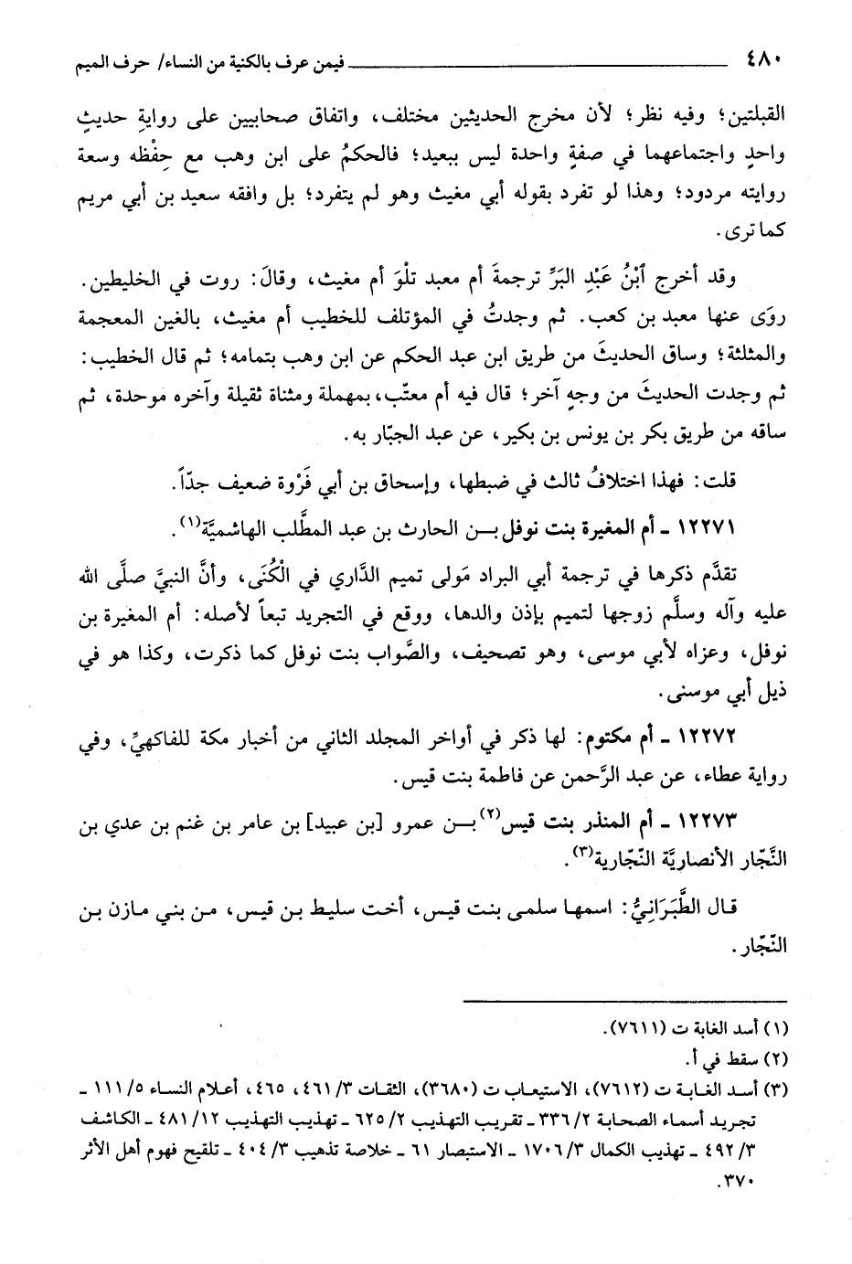 تقدّم ذكرها في ترجمة أبي البراد مولى تميم الدّاري في الكنى، وأنّ النبيّ صلّى اللَّه عليه وآله وسلّم زوجها لتميم بإذن والدها، ووقع في التجريد تبعا لأصله: أم المغيرة بن نوفل، وعزاه لأبي موسى، وهو تصحيف، والصّواب بنت نوفل كما ذكرت، وكذا هو في ذيل أبي موسى.