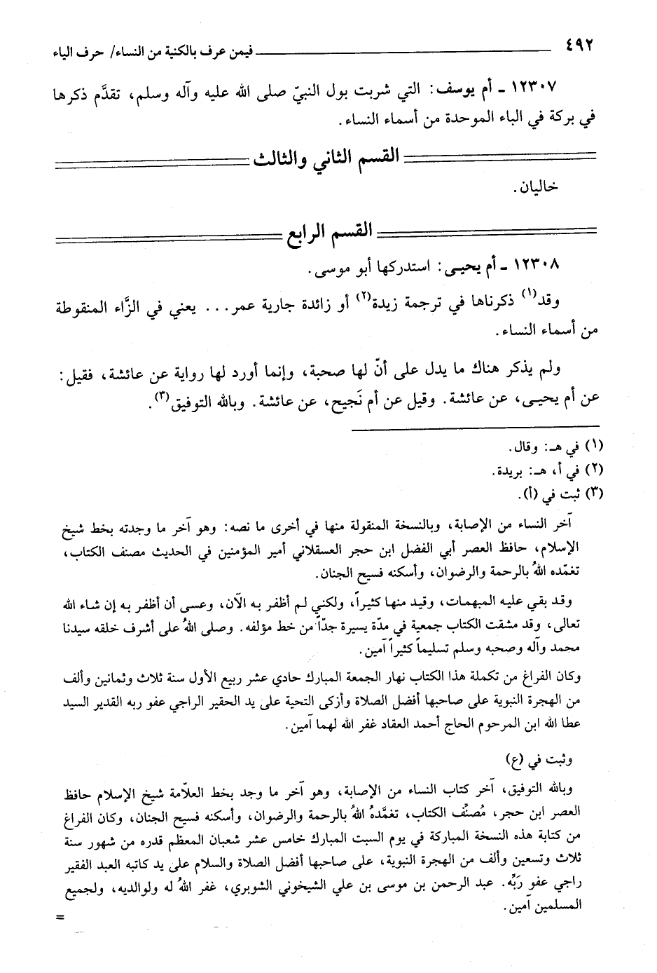 (٣) ثبت في (أ) . آخر النساء من الإصابة، وبالنسخة المنقولة منها في أخرى ما نصه: وهو آخر ما وجدته بخط شيخ الإسلام، حافظ العصر أبي الفضل ابن حجر العسقلاني أمير المؤمنين في الحديث مصنف الكتاب، تغمّده اللَّه بالرحمة والرضوان، وأسكنه فسيح الجنان. وقد بقي عليه المبهمات، وقيد منها كثيرا، ولكني لم أظفر به الآن، وعسى أن أظفر به إن شاء اللَّه تعالى، وقد مشقت الكتاب جمعية في مدّة يسيرة جدّا من خط مؤلفه. وصلى اللَّه على أشرف خلقه سيدنا محمد وآله وصحبه وسلم تسليما كثيرا آمين. وكان الفراغ من تكملة هذا الكتاب نهار الجمعة المبارك حادي عشر ربيع الأول سنة ثلاث وثمانين وألف من الهجرة النبويّة على صاحبها أفضل الصلاة وأزكى التحية على يد الحقير الراجي عفو ربه القدير السيد عطا اللَّه ابن المرحوم الحاج أحمد العقاد غفر اللَّه لهما آمين. وثبت في (ع) وباللَّه التوفيق، آخر كتاب النساء من الإصابة، وهو آخر ما وجد بخط العلّامة شيخ الإسلام حافظ العصر ابن حجر، مصنّف الكتاب، تغمّده اللَّه بالرحمة والرضوان، وأسكنه فسيح الجنان، وكان الفراغ من كتابة هذه النسخة المباركة في يوم السبت المبارك خامس عشر شعبان المعظم قدره من شهور سنة ثلاث وتسعين وألف من الهجرة النبويّة، على صاحبها أفضل الصلاة والسلام على يد كاتبه العبد الفقير راجي عفو ربّه. عبد الرحمن بن موسى بن علي الشيخوني الشوبري، غفر اللَّه له ولوالديه، ولجميع المسلمين آمين.