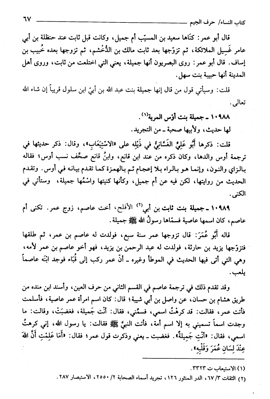 قلت: ذكرها أبو عليّ الغسّانيّ في ذيله على «الاستيعاب» ، وقال: ذكر حديثها في ترجمة أوس والدها، وكان ذكره من عند ابن قانع، وابن قانع صحّف نسب أوس، فقاله بالزاي والنون، وإنما هو بالراء بلا إعجام ثم بالهمزة كما تقدم بيانه في أوس. وتقدم الحديث من روايتها، لكن فيه عن أم جميل، وكأنها كنيتها واسمها جميلة، وستأتي في الكنى.