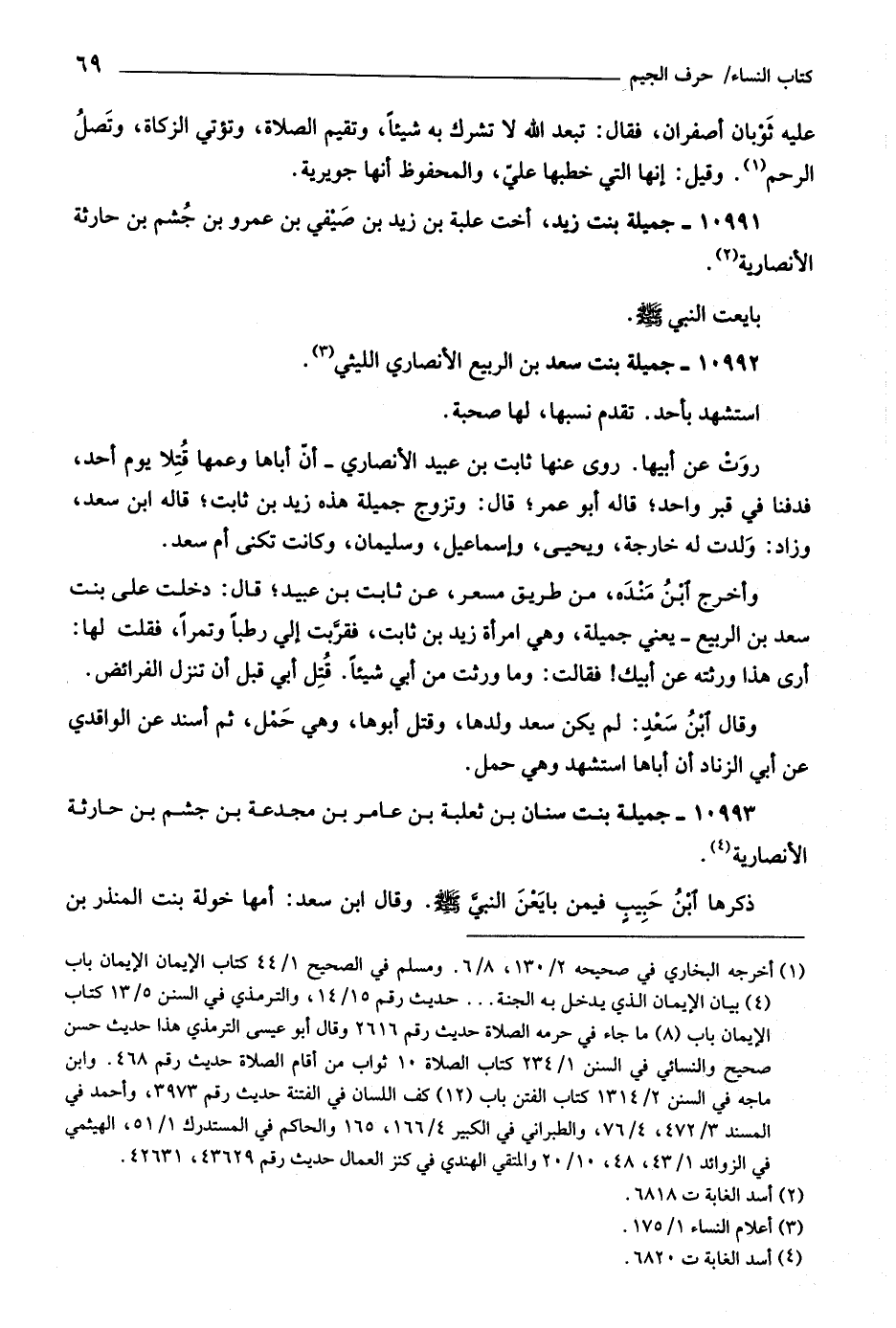 وأخرج ابن مندة، من طريق مسعر، عن ثابت بن عبيد، قال: دخلت على بنت سعد بن الربيع- يعني جميلة، وهي امرأة زيد بن ثابت، فقرّبت إلي رطبا وتمرا، فقلت لها: