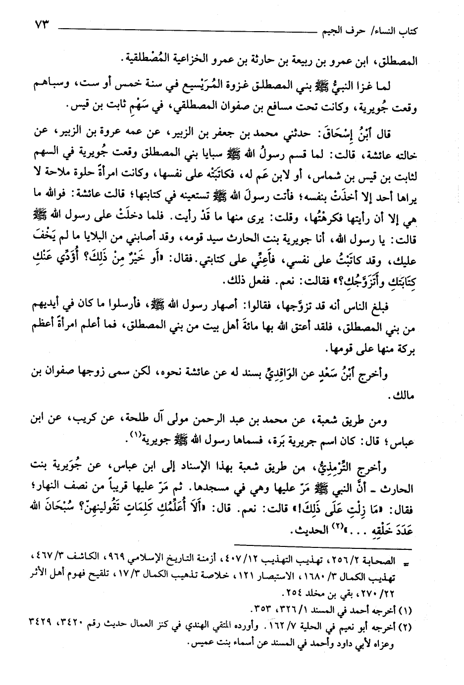 قال ابن إسحاق: حدثني محمد بن جعفر بن الزبير، عن عمه عروة بن الزبير، عن خالته عائشة، قالت: لما قسم رسول اللَّه صلّى اللَّه عليه وسلّم سبايا بني المصطلق وقعت جويرية في السهم لثابت بن قيس بن شماس، أو لابن عم له، فكاتبته على نفسها، وكانت امرأة حلوة ملاحة لا يراها أحد إلا أخذت بنفسه، فأتت رسول اللَّه صلّى اللَّه عليه وسلّم تستعينه في كتابتها، قالت عائشة: فو اللَّه ما هي إلا أن رأيتها فكرهتها، وقلت: يرى منها ما قد رأيت. فلما دخلت على رسول اللَّه صلّى اللَّه عليه وسلّم قالت: يا رسول اللَّه، أنا جويرية بنت الحارث سيد قومه، وقد أصابني من البلايا ما لم يخف عليك، وقد كاتبت على نفسي، فأعنّي على كتابتي. فقال: «أو خير من ذلك؟ أؤدّي عنك كتابتك وأتزوّجك؟» فقالت: نعم. ففعل ذلك.