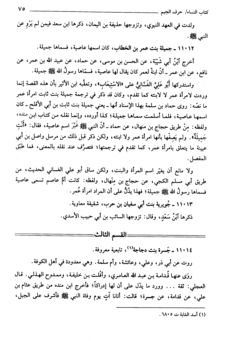 واستدركها أبو عليّ الغسّانيّ على «الاستيعاب» ، وتعقّبه ابن الأثير بأن هذه القصة إنما وردت لامرأة عمر لا لابنته كما تقدم، وكان قد ذكر في ترجمة جميلة بنت ثابت امرأة عمر ما نصّه: روى حماد بن سلمة بهذا الإسناد أنها- يعني جميلة بنت ثابت بن أبي الأقلح- كان اسمها عاصية، فلما أسلمت سماها جميلة، كذا أورده، وإنما نقله من كتاب ابن مندة، ولفظه:
