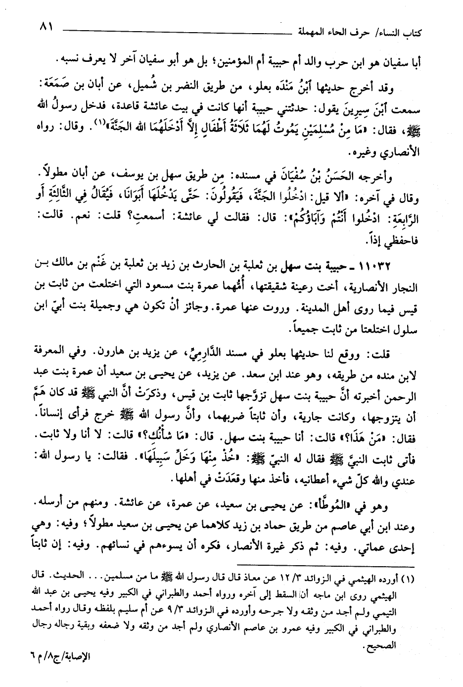 سمعت ابن سيرين يقول: حدثتني حبيبة أنها كانت في بيت عائشة قاعدة، فدخل رسول اللَّه صلّى اللَّه عليه وسلّم، فقال: «ما من مسلمين يموت لهما ثلاثة أطفال إلّا أدخلهما اللَّه الجنّة» «١» . وقال: رواه الأنصاري وغيره.