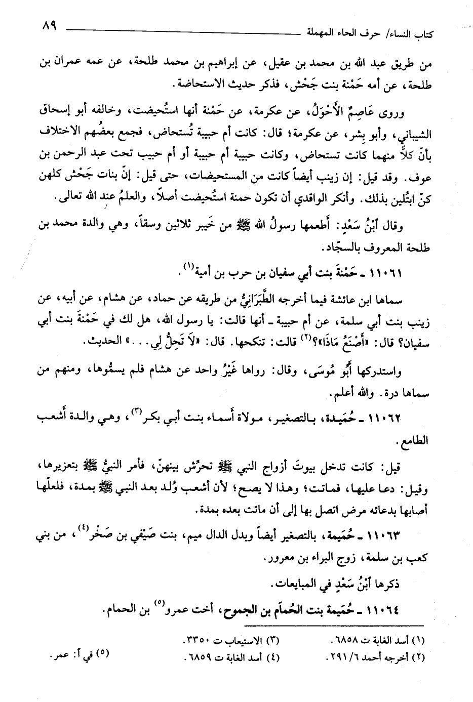 وروى عاصم الأحول، عن عكرمة، عن حمنة أنها استحيضت، وخالفه أبو إسحاق الشيبانيّ، وأبو بشر، عن عكرمة، قال: كانت أم حبيبة تستحاض، فجمع بعضهم الاختلاف بأنّ كلّا منهما كانت تستحاض، وكانت حبيبة أم حبيبة أو أم حبيب تحت عبد الرحمن بن عوف. وقد قيل: إن زينب أيضا كانت من المستحيضات، حتى قيل: إنّ بنات جحش كلهن كنّ ابتلين بذلك. وأنكر الواقدي أن تكون حمنة استحيضت أصلا، والعلم عند اللَّه تعالى.