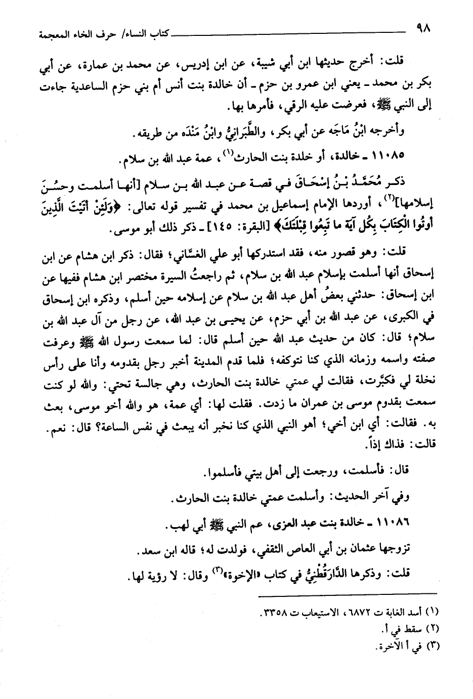 قلت: وهو قصور منه، فقد استدركها أبو علي الغسّاني، فقال: ذكر ابن هشام عن ابن إسحاق أنها أسلمت بإسلام عبد اللَّه بن سلام، ثم راجعت السيرة مختصر ابن هشام ففيها عن ابن إسحاق: حدثني بعض أهل عبد اللَّه بن سلام عن إسلامه حين أسلم، وذكره ابن إسحاق في الكبرى، عن عبد اللَّه بن أبي حزم، عن يحيى بن عبد اللَّه، عن رجل من آل عبد اللَّه بن سلام، قال: كان من حديث عبد اللَّه حين أسلم قال: لما سمعت رسول اللَّه صلّى اللَّه عليه وسلّم وعرفت صفته واسمه وزمانه الّذي كنا نتوكفه، فلما قدم المدينة أخبر رجل بقدومه وأنا على رأس نخلة لي فكبّرت، فقالت لي عمتي خالدة بنت الحارث، وهي جالسة تحتي: واللَّه لو كنت سمعت بقدوم موسى بن عمران ما زدت. فقلت لها: أي عمة، هو واللَّه أخو موسى، بعث به. فقالت: أي ابن أخي، أهو النبي الّذي كنا نخبر أنه يبعث في نفس الساعة؟ قال: نعم.