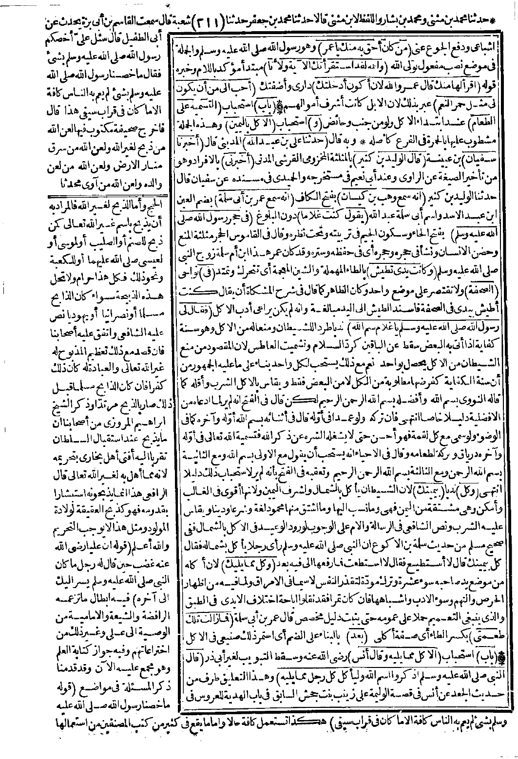 (باب) استحباب (التسمية على الطعام) عند ابتداء الأكل ولو من جنب وحائض (و) استحباب (الأكل باليمين) وهذه الجملة مشطوب عليها بالحمرة في الفرع كأصله.