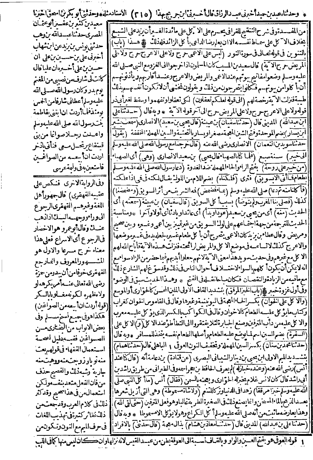 وبه قال: (حدّثنا علي بن عبد الله) المديني قال: (حدّثنا سفيان) بن عيينة (قال يحيى بن سعيد) الأنصاري (سمعت بشير بن يسار) بضم الموحدة وفتح الشين المعجمة مصغرًا ويسار بالتحتية والسين المهملة المخففة (يقول: حدّثنا سويد بن النعمان) الأنصاري -رضي الله عنه- (قال: خرجنا مع رسول الله -صَلَّى اللَّهُ عَلَيْهِ وَسَلَّمَ- إلى خيبر) سنة سبع (فلما كنا بالصهباء. قال يحيى) بن سعد الأنصاري (وهي) أي الصهباء (من خيبر على روحة) بفتح الراء والحاء المهملة ضد الغدوة (دعا رسول الله -صَلَّى اللَّهُ عَلَيْهِ وَسَلَّمَ- بطعام فما أُتي إلا بسويق) فثري (فلكناه) بضم اللام من اللوك يقال لكنه في فمي إذا علكته (فأكلنا منه ثم دعا) -صَلَّى اللَّهُ عَلَيْهِ وَسَلَّمَ- (بماء فمضمض) فمه الشريف من أثر السويق (ومضمضنا) كذلك (فصلى بنا المغرب ولم يتوضأ) بسبب أكل السويق (قال سفيان) بن عيينة (سمعته) أي الحديث (منه) أي من يحيى بن سعيد (عودًا وبدءًا) أي عائدًا وبادئًا أي أولًا وآخرًا.