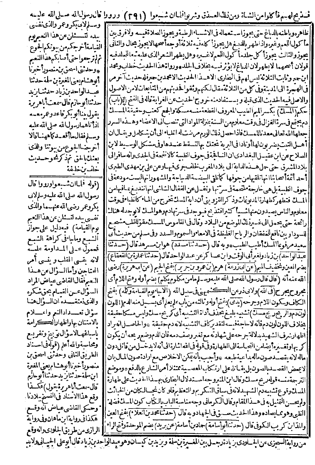 (باب) حكم (المسك) بكسر الميم الطيب المعروف القطعة منه مسكة والجمع كعنب وحقيقة المسك دم يجتمع في سرّة الغزال في وقت معلوم من السنة بمنزلة المواد التي تنصب إلى الأعضاء، وهذا السرر جعلها الله تعالى معدنًا للمسك فإذا حصل ذلك الورم مرضت له الظباء إلى أن يتكامل، ويقال: إن أهل التبت يضربون لها أوتاد في البرية تحتك بها لتسقط عندها، وفي مشكل الوسيط لابن الصلاح عن ابن عقيل البغدادي أن النافجة في جوف الظبية كالأنفجة في الجدي وأنه سافر إلى بلاد المشرق حتى حمل هذه الدابة إلى بلاد المغرب لخلف جرى فيها، وعن علي بن مهدي الطبري أحد أئمة أصحابنا أنها تلقيها من جوفها كما تلقي البيضة الدجاجة والمشهور أنها ليست مودعة في جوف الظبية بل هي خارجة ملتحمة في سرّتها، ونقل عن القفال الشاشي أنها تندبغ بما فيها من المسك فتطهر كطهارة المدبوغات وذكر القزويني أن دابة المسك تخرج من الماء كالظباء في وقت معلوم والناس يصيدون منها شيئًا كثيرًا فتذبح فيوجد في سرتها دم وهو المسك لا يوجد له هناك رائحة حتى يحمل إلى غير ذلك الموضع من البلاد. وقال في القاموس: المسك مقوّ للقلب مشجع للسوداويين نافع للخفقان والرياح الغليظة في الأمعاء والسموم والسدد، وفي مسلم من حديث أبي سعيد مرفوعًا: "المسك أطيب الطيب".