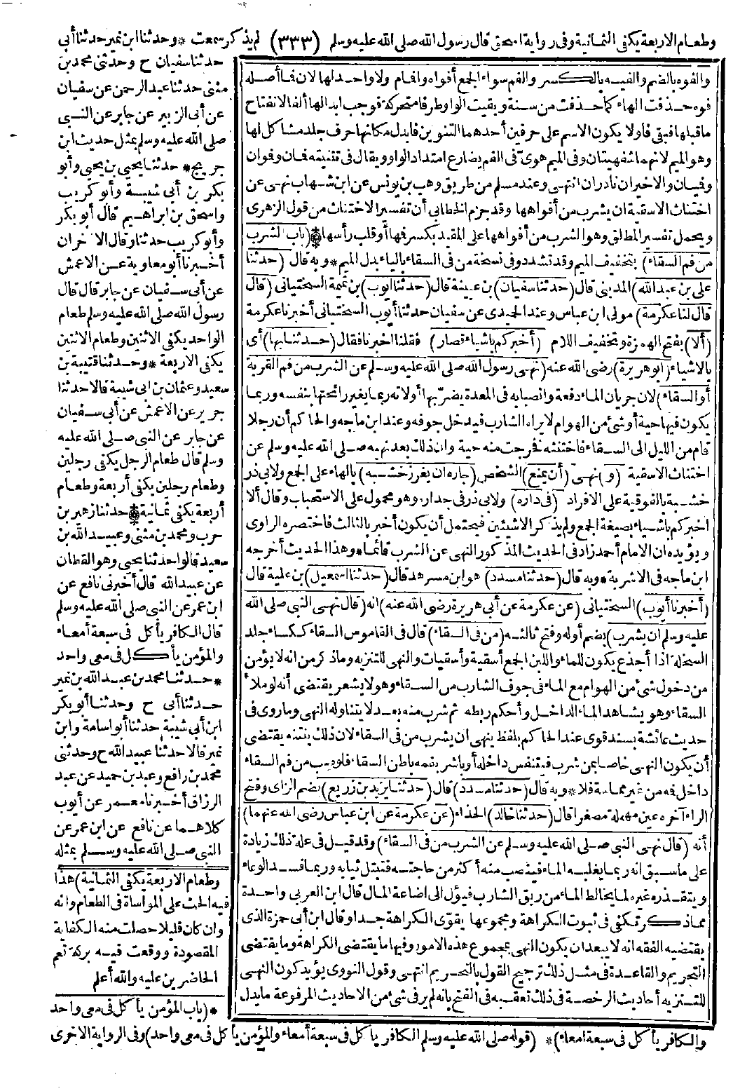 وعند مسلم من طريق وهب بن يونس عن ابن شهاب نهى عن اختناث الأسقية أن يشرب من أفواهها وقد جزم الخطابي أن تفسير الاختناث من قول الزهري ويحمل تفسير الطلق وهو الشرب من أفواهها على المقيد بكسر فمها أو قلب رأسها.