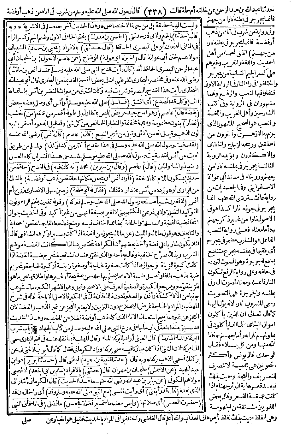 5638 - حَدَّثَنَا الْحَسَنُ بْنُ مُدْرِكٍ قَالَ: حَدَّثَنِى يَحْيَى بْنُ حَمَّادٍ أَخْبَرَنَا أَبُو عَوَانَةَ عَنْ عَاصِمٍ الأَحْوَلِ قَالَ: رَأَيْتُ قَدَحَ النَّبِيِّ -صَلَّى اللَّهُ عَلَيْهِ وَسَلَّمَ- عِنْدَ أَنَسِ بْنِ مَالِكٍ، وَكَانَ قَدِ انْصَدَعَ فَسَلْسَلَهُ بِفِضَّةٍ قَالَ: وَهْوَ قَدَحٌ جَيِّدٌ عَرِيضٌ مِنْ نُضَارٍ قَالَ أَنَسٌ: لَقَدْ سَقَيْتُ رَسُولَ اللَّهِ -صَلَّى اللَّهُ عَلَيْهِ وَسَلَّمَ- فِى هَذَا الْقَدَحِ أَكْثَرَ مِنْ كَذَا وَكَذَا. قَالَ: وَقَالَ ابْنُ سِيرِينَ: إِنَّهُ كَانَ فِيهِ حَلْقَةٌ مِنْ حَدِيدٍ فَأَرَادَ أَنَسٌ أَنْ يَجْعَلَ مَكَانَهَا حَلْقَةً مِنْ ذَهَبٍ أَوْ فِضَّةٍ فَقَالَ لَهُ أَبُو طَلْحَةَ: لاَ تُغَيِّرَنَّ شَيْئًا صَنَعَهُ رَسُولُ اللَّهِ -صَلَّى اللَّهُ عَلَيْهِ وَسَلَّمَ- فَتَرَكَهُ.