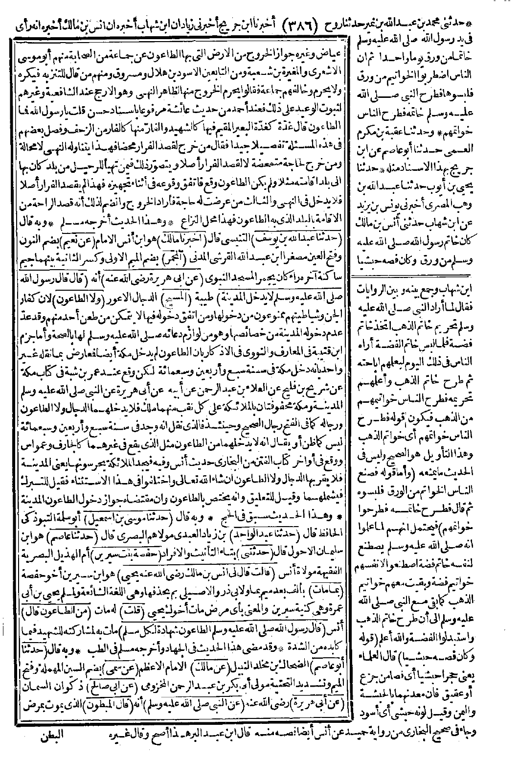 وبه قال: (حدّثنا موسى بن إسماعيل) أبو سلمة التبوذكي الحافظ قال: (حدّثنا عبد الواحد) بن زياد العبدي مولاهم البصري قال: (حدّثنا عاصم) هو ابن سليمان الأحول قال: (حدّثتني) بتاء التأنيث والإفراد (حفصة بنت سيرين) أم الهذيل البصرية الفقيهة مولاة أنس (قالت: قال لي أنس بن مالك -رضي الله عنه-: يحيى) هو ابن سيرين أخو حفصة (بما مات) بألف بعد ميم بما ولأبي ذر والأصيلي بِمَ بحذفها وهي اللغة الشائعة ولمسلم يحيى بن أبي عمرة وهي كنية سيرين والمعنى بأي مرض مات أخوك يحيى؟ (قلت) له مات (من الطاعون، قال) أنس: (قال رسول الله -صَلَّى اللَّهُ عَلَيْهِ وَسَلَّمَ-)