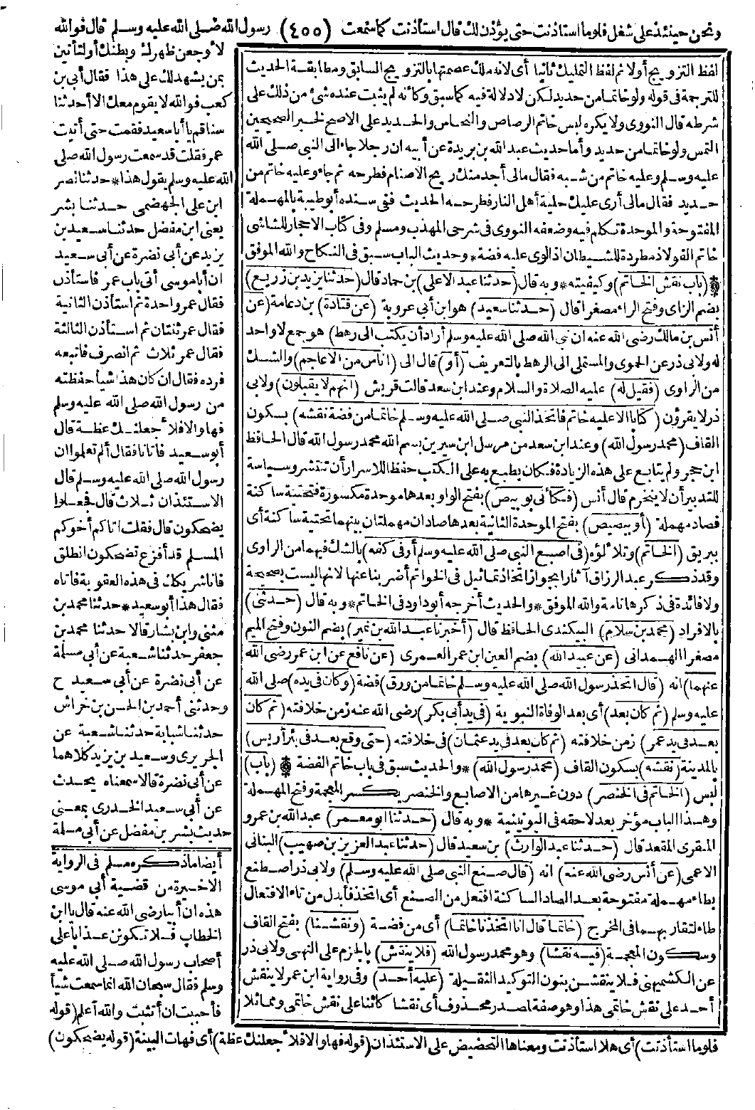 5873 - حَدَّثَنِى مُحَمَّدُ بْنُ سَلاَمٍ، أَخْبَرَنَا عَبْدُ اللَّهِ بْنُ نُمَيْرٍ، عَنْ عُبَيْدِ اللَّهِ، عَنْ نَافِعٍ عَنِ ابْنِ عُمَرَ - رضى الله عنهما - قَالَ: اتَّخَذَ رَسُولُ اللَّهِ -صَلَّى اللَّهُ عَلَيْهِ وَسَلَّمَ- خَاتَمًا مِنْ وَرِقٍ وَكَانَ فِى يَدِهِ ثُمَّ كَانَ بَعْدُ فِى يَدِ أَبِى بَكْرٍ، ثُمَّ كَانَ بَعْدُ فِى يَدِ عُمَرَ، ثُمَّ كَانَ بَعْدُ فِى يَدِ عُثْمَانَ حَتَّى وَقَعَ بَعْدُ فِى بِئْرِ أَرِيسَ نَقْشُهُ مُحَمَّدٌ رَسُولُ اللَّهِ.