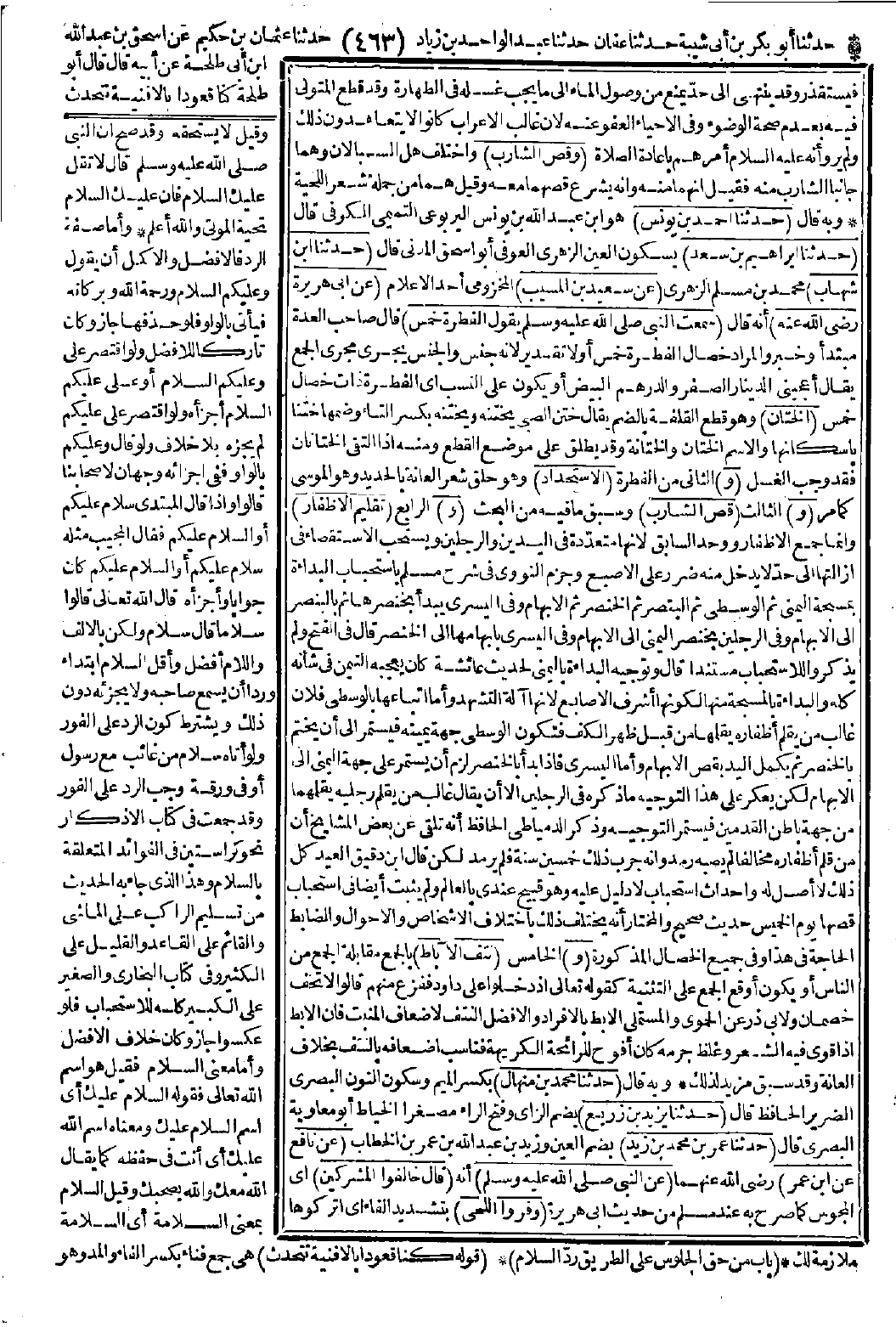 وبه قال: (حدّثنا محمد بن منهال) بكسر الميم وسكون النون البصري الضرير الحافظ قال: (حدّثنا يزيد بن زريع) بضم الزاي وفتح الراء مصغرًا الخياط أبو معاوية البصري قال: (حدّثنا عمر بن محمد بن زيد) بضم العين وزيد بن عبد الله بن عمر بن الخطاب (عن نافع عن ابن عمر) -رضي الله عنهما- (عن النبي -صَلَّى اللَّهُ عَلَيْهِ وَسَلَّمَ-) أنه (قال):