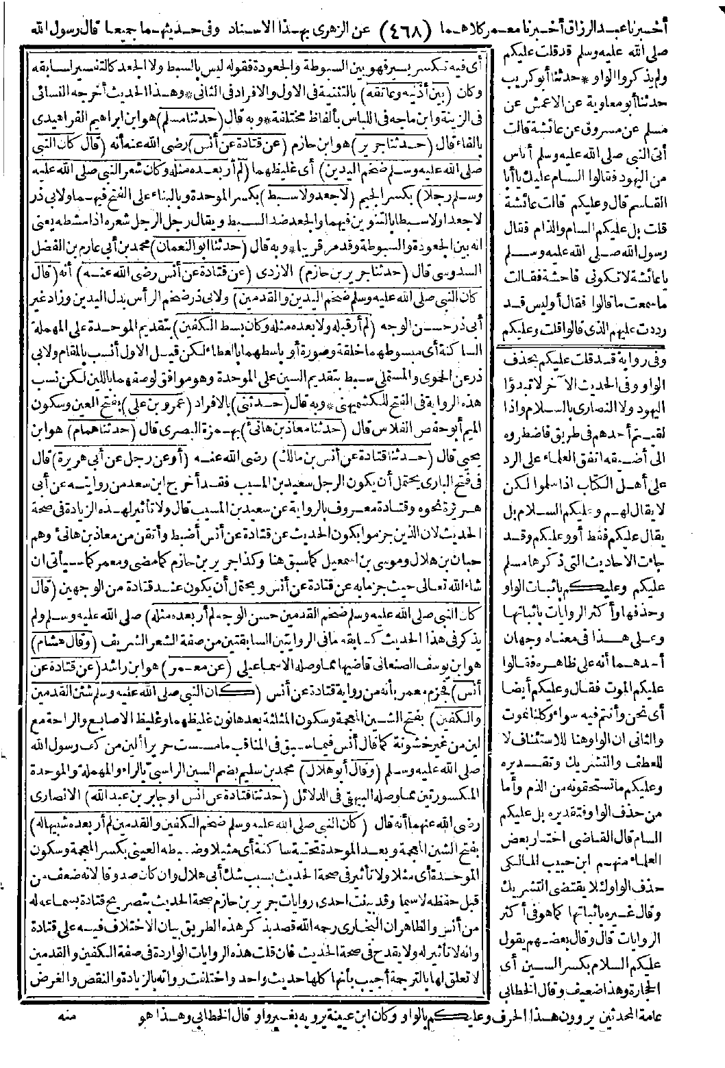5907 - حَدَّثَنَا أَبُو النُّعْمَانِ، حَدَّثَنَا جَرِيرُ بْنُ حَازِمٍ، عَنْ قَتَادَةَ، عَنْ أَنَسٍ - رضى الله عنه - قَالَ: كَانَ النَّبِىُّ -صَلَّى اللَّهُ عَلَيْهِ وَسَلَّمَ- ضَخْمَ الْيَدَيْنِ وَالْقَدَمَيْنِ لَمْ أَرَ قَبْلَهُ وَلاَ بَعْدَهُ مِثْلَهُ وَكَانَ بَسِطَ الْكَفَّيْنِ. [الحديث 5907 - أطرافه في: 5908، 5910، 5911].