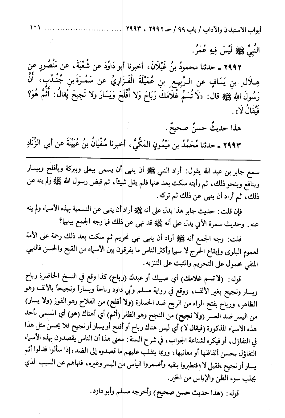قَوْلُهُ (لَا تُسَمِّ غُلَامَكَ) أَيْ صَبِيَّكَ أَوْ عَبْدَكَ (رَبَاحَ) كَذَا وَقَعَ فِي النُّسَخِ الْحَاضِرَةِ رَبَاحَ وَيَسَارَ وَنَجِيحَ بِغَيْرِ الْأَلِفِ وَوَقَعَ فِي رِوَايَةِ مُسْلِمٍ وَأَبِي دَاوُدَ رَبَاحًا وَيَسَارًا وَنَجِيحًا بِالْأَلِفِ وَهُوَ الظَّاهِرُ وَرَبَاحٌ بِفَتْحِ الرَّاءِ مِنَ الرِّبْحِ ضِدُّ الْخَسَارَةِ (وَلَا أَفْلَحَ) مِنَ الْفَلَاحِ وَهُوَ الْفَوْزُ (وَلَا يَسَارَ) مِنَ الْيُسْرِ ضِدُّ الْعُسْرِ (وَلَا نَجِيحَ) مِنَ النَّجْحِ وَهُوَ الظَّفَرُ (أَثَمَّ) أَيْ أَهُنَاكَ (هُوَ) أَيِ الْمُسَمَّى بِأَحَدِ هَذِهِ الْأَسْمَاءِ الْمَذْكُورَةِ (فَيُقَالُ لَا) أَيْ لَيْسَ هُنَاكَ رَبَاحٌ أَوْ أَفْلَحُ أَوْ يَسَارٌ أَوْ نَجِيحٌ فَلَا يَحْسُنُ مِثْلُ هَذَا فِي التَّفَاؤُلِ أَوْ فَيُكْرَهُ لِشَنَاعَةِ الْجَوَابِ فِي شَرْحِ السُّنَّةِ مَعْنَى هَذَا أَنَّ النَّاسَ يَقْصِدُونَ بِهَذِهِ الْأَسْمَاءِ التَّفَاؤُلَ بِحُسْنِ أَلْفَاظِهَا أَوْ مَعَانِيهَا وَرُبَّمَا يَنْقَلِبُ عَلَيْهِمْ مَا قَصَدُوهُ إِلَى الضِّدِّ إِذَا سَأَلُوا فَقَالُوا أَثَمَّ يَسَارٌ أَوْ نَجِيحٌ فَقِيلَ لَا تَتَطَيَّرُوا بِنَفْيِهِ وَاضْمُرُوا الْيَأْسَ مِنَ الْيُسْرِ وَغَيْرِهِ فَنَهَاهُمْ عَنِ السَّبَبِ الَّذِي يَجْلِبُ سُوءَ الظَّنِّ وَالْإِيَاسَ مِنَ الْخَيْرِ