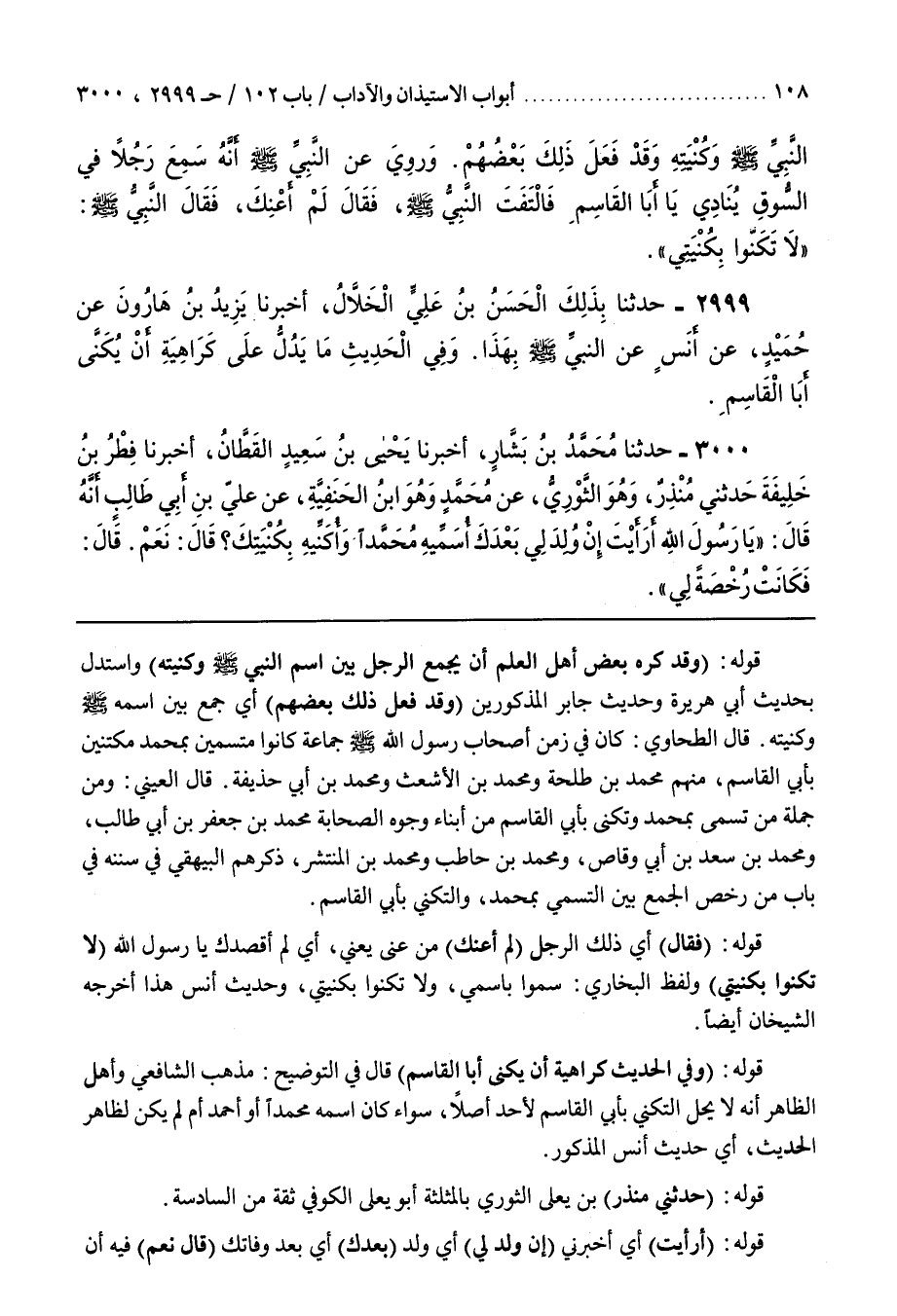 قَوْلُهُ (وَقَدْ كَرِهَ بَعْضُ أَهْلِ الْعِلْمِ أَنْ يَجْمَعَ الرَّجُلُ بَيْنَ اسْمِ النَّبِيِّ صَلَّى اللَّهُ عَلَيْهِ وَسَلَّمَ وَكُنْيَتِهِ) وَاسْتَدَلَّ بِحَدِيثِ أَبِي هُرَيْرَةَ وَحَدِيثِ جَابِرٍ الْمَذْكُورَيْنِ (وَقَدْ فَعَلَ ذَلِكَ بَعْضُهُمْ) أَيْ جَمَعَ بَيْنَ اسْمِهِ صَلَّى اللَّهُ عَلَيْهِ وَسَلَّمَ وَكُنْيَتِهِ