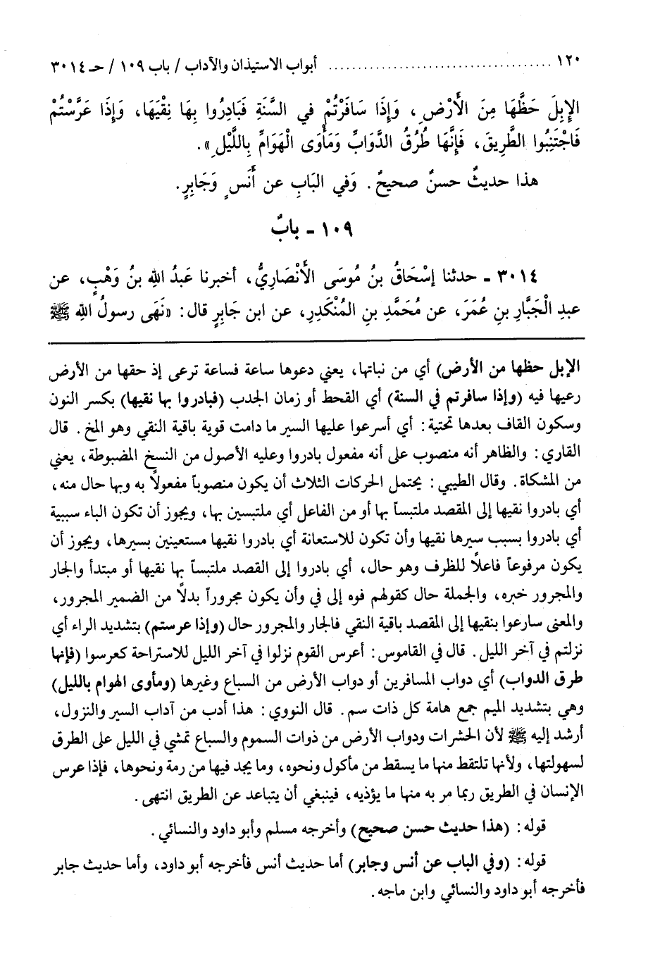 وَقَالَ الطِّيبِيُّ يَحْتَمِلُ الْحَرَكَاتِ الثَّلَاثَ أَنْ يكون منصوبا مفعولا به وبها حَالٌ مِنْهُ أَيْ بَادِرُوا نِقْيَهَا إِلَى الْمَقْصِدِ مُلْتَبِسًا بِهَا أَوْ مِنَ الْفَاعِلِ أَيْ مُلْتَبِسِينَ بِهَا وَيَجُوزُ أَنْ تَكُونَ الْبَاءُ سَبَبِيَّةً أَيْ بادروا بسبب سَيْرِهَا نِقْيَهَا وَأَنْ تَكُونَ لِلِاسْتِعَانَةِ أَيْ بَادِرُوا نِقْيَهَا مُسْتَعِينِينَ بِسَيْرِهَا وَيَجُوزُ أَنْ يَكُونَ مَرْفُوعًا فاعلا للظرف وهو حال أيي بَادِرُوا إِلَى الْمَقْصِدِ مُلْتَبِسًا بِهَا نِقْيُهَا أَوْ مُبْتَدَأٌ وَالْجَارُّ وَالْمَجْرُورُ خَبَرُهُ وَالْجُمْلَةُ حَالٌ كَقَوْلِهِمْ فُوهُ إِلَى فِي وَأَنْ يَكُونَ مَجْرُورًا بَدَلًا مِنَ الضَّمِيرِ الْمَجْرُورِ وَالْمَعْنَى سَارِعُوا بِنِقْيِهَا إِلَى الْمَقْصِدِ بَاقِيَةَ النِّقْيِ فَالْجَارُّ وَالْمَجْرُورُ حَالٌ (وَإِذَا عرستم) بتشديد الراء أي نزلتم بالليل
