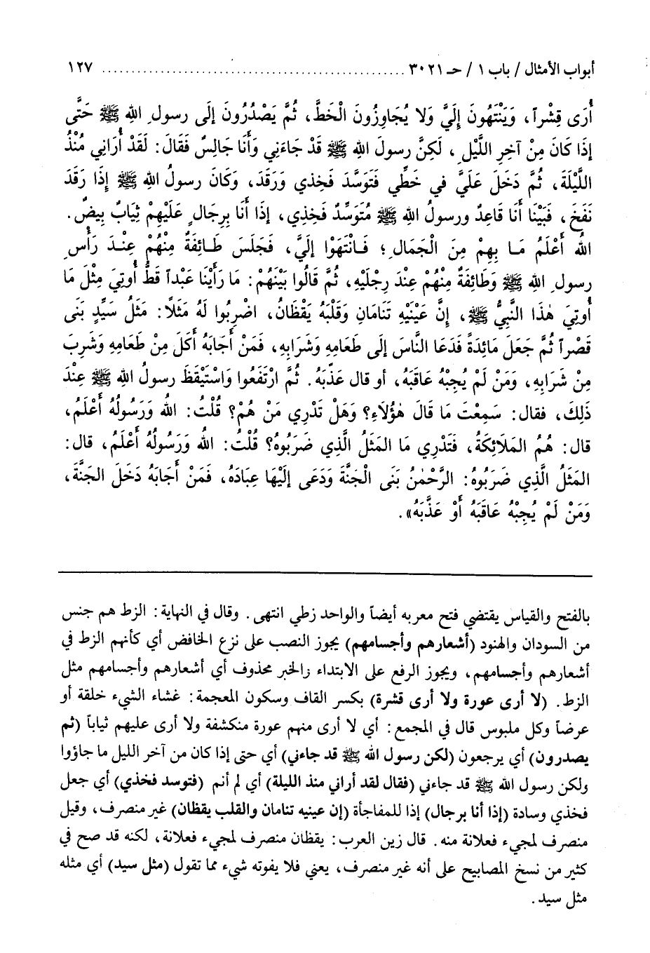 وَقَالَ فِي النِّهَايَةِ الزُّطُّ هُمْ جِنْسٌ مِنَ السُّودَانِ وَالْهُنُودِ (أَشْعَارَهُمْ وَأَجْسَامَهُمْ) يَجُوزُ النَّصْبُ عَلَى نَزْعِ الْخَافِضِ أَيْ كَأَنَّهُمِ الزُّطُّ فِي أَشْعَارِهِمْ وَأَجْسَامِهِمْ وَيَجُوزُ الرَّفْعُ عَلَى الِابْتِدَاءِ وَالْخَبَرُ مَحْذُوفٌ أَيْ أَشْعَارُهُمْ وَأَجْسَامُهُمْ مِثْلُ الزُّطِّ (لا أرى عورة ولا أرى قشرة) بِكَسْرِ الْقَافِ وَسُكُونِ الْمُعْجَمَةِ غِشَاءُ الشَّيْءِ خِلْقَةً أَوْ عَرَضًا وَكُلُّ مَلْبُوسٍ قَالَ فِي الْمَجْمَعِ أَيْ لَا أَرَى مِنْهُمْ عَوْرَةً مُنْكَشِفَةً وَلَا أَرَى عَلَيْهِمْ ثِيَابًا (ثُمَّ يَصْدُرُونَ) أَيْ يَرْجِعُونَ (لَكِنَّ رَسُولُ اللَّهِ صَلَّى اللَّهُ عَلَيْهِ وَسَلَّمَ قَدْ جَاءَنِي) أَيْ حَتَّى إِذَا كَانَ مِنْ آخر الليل ما جاؤا وَلَكِنَّ رَسُولَ اللَّهِ صَلَّى اللَّهُ عَلَيْهِ وَسَلَّمَ قَدْ جَاءَنِي (فَقَالَ لَقَدْ أُرَانِي مُنْذُ اللَّيْلَةِ) أَيْ لَمْ أَنَمْ (فَتَوَسَّدَ فَخِذِي) أَيْ جَعَلَ فَخِذِي وِسَادَةً (إِذَا أَنَا بِرِجَالٍ) إِذَا لِلْمُفَاجَأَةِ (إن عينيه تنامان والقلب يَقْظَانُ) غَيْرُ مُنْصَرِفٍ وَقِيلَ مُنْصَرِفٌ لِمَجِيءِ فَعْلَانَةٍ مِنْهُ