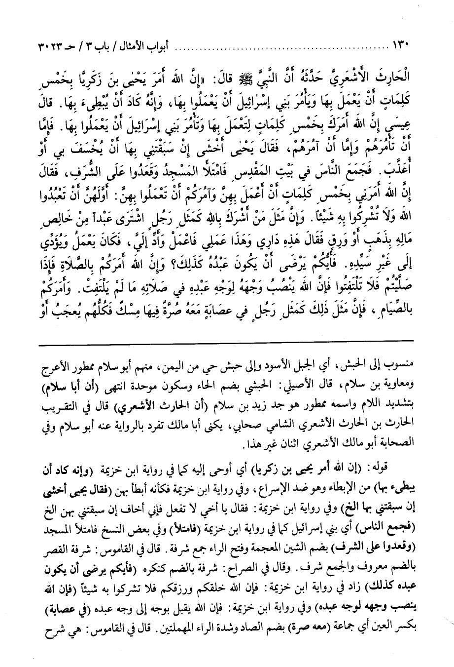 قَوْلُهُ (إِنَّ اللَّهَ أَمَرَ يَحْيَى بْنَ زَكَرِيَّا) أَيْ أَوْحَى إِلَيْهِ كما في رواية بن خزيمة (وإنه كاد أن يبطىء بِهَا) مِنَ الْإِبْطَاءِ وَهُوَ ضِدُّ الْإِسْرَاعِ وَفِي رواية بن خُزَيْمَةَ فَكَأَنَّهُ أَبْطَأَ بِهِنَّ (فَقَالَ يَحْيَى أَخْشَى إن سبقتني بها الخ) وفي رواية بن خُزَيْمَةَ فَقَالَ يَا أَخِي لَا تَفْعَلْ فَإِنِّي أَخَافُ إِنْ سَبَقْتَنِي بِهِنَّ إِلَخْ (فَجَمَعَ النَّاسَ) أي بنى إسرائيل كما في رواية بن خُزَيْمَةَ (فَامْتَلَأَ) وَفِي بَعْضِ النُّسَخِ فَامْتَلَأَ الْمَسْجِدُ (وَقَعَدُوا عَلَى الشُّرَفِ) بِضَمِّ الشِّينِ الْمُعْجَمَةِ وَفَتْحِ الرَّاءِ جَمْعُ شُرْفَةٍ