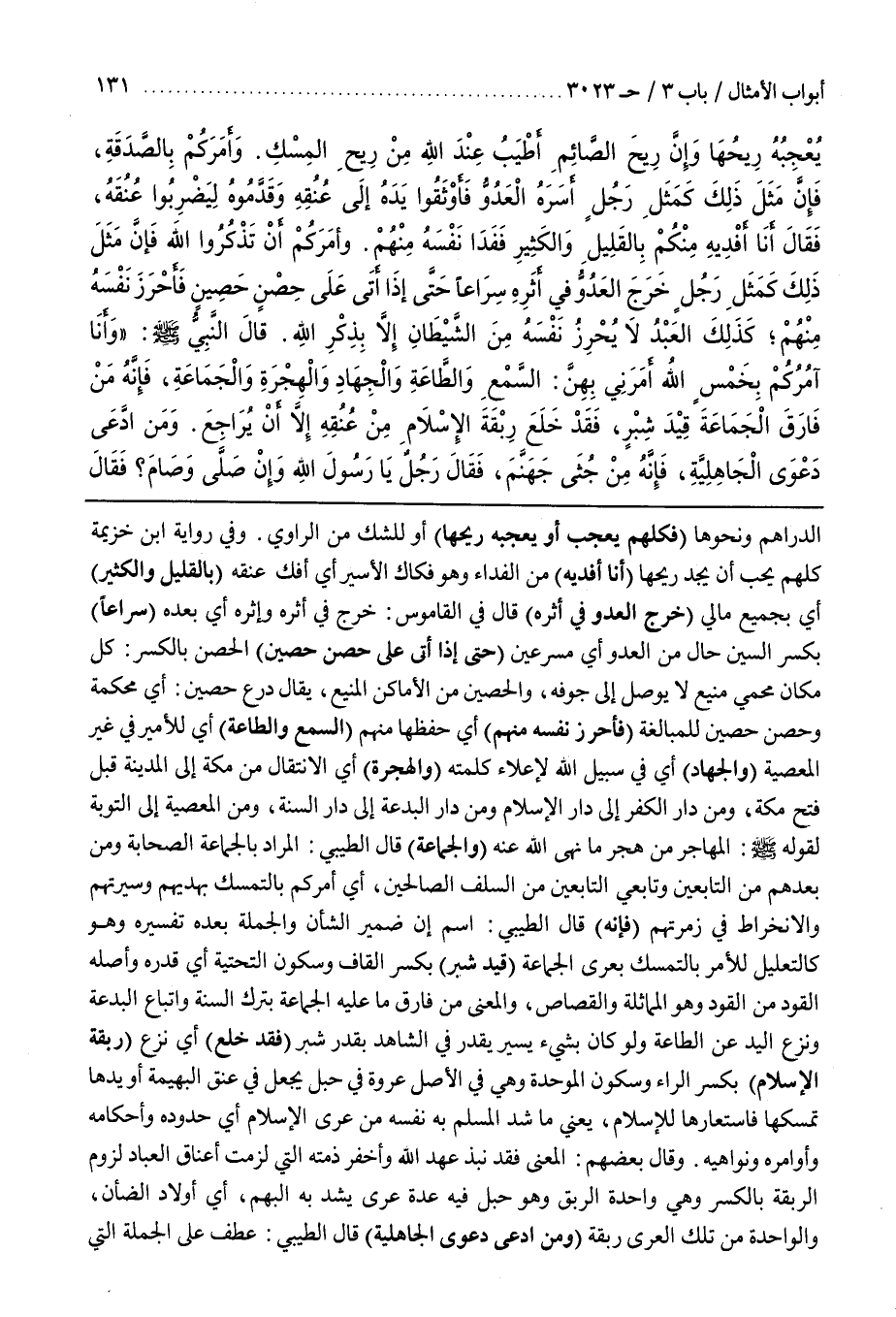 الدَّرَاهِمِ وَنَحْوِهَا (فَكُلُّهُمْ يُعْجَبُ أَوْ يُعْجِبُهُ رِيحُهَا) أو للشك من الراوي وفي رواية بن خُزَيْمَةَ كُلُّهُمْ يُحِبُّ أَنْ يَجِدَ رِيحَهَا (أَنَا أَفْدِيهِ) مِنَ الْفِدَاءِ وَهُوَ فِكَاكُ الْأَسِيرِ أَيْ أَفُكُّ عُنُقِي (بِالْقَلِيلِ وَالْكَثِيرِ) أَيْ بِجَمِيعِ مَالِي (خَرَجَ الْعَدُوُّ فِي أَثَرِهِ) قَالَ فِي الْقَامُوسِ خَرَجَ فِي إِثْرِهِ وَأَثَرِهِ أَيْ بَعْدَهُ (سِرَاعًا) بِكَسْرِ السِّينِ حَالٌ مِنَ الْعَدُوِّ أَيْ مُسْرِعِينَ (حَتَّى إِذَا أَتَى عَلَى حِصْنٍ حَصِينٍ) الْحِصْنُ بِالْكَسْرِ كُلُّ مَكَانٍ مَحْمِيٍّ مَنِيعٍ لَا يُوصَلُ إِلَى جَوْفِهِ وَالْحَصِينُ مِنَ الْأَمَاكِنِ الْمَنِيعُ يُقَالُ دِرْعٌ حَصِينٌ أَيْ مُحْكَمَةٌ وَحِصْنٌ حَصِينٌ لِلْمُبَالَغَةِ (فَأَحْرَزَ نَفْسَهُ مِنْهُمْ) أَيْ حَفِظَهَا مِنْهُمْ (السَّمْعُ وَالطَّاعَةُ) أَيْ لِلْأَمِيرِ فِي غَيْرِ الْمَعْصِيَةِ (وَالْجِهَادُ) أَيْ فِي سَبِيلِ اللَّهِ لِإِعْلَاءِ كَلِمَتِهِ (وَالْهِجْرَةُ) أَيِ الِانْتِقَالُ مِنْ مَكَّةَ إِلَى الْمَدِينَةِ قَبْلَ فَتْحِ مَكَّةَ وَمِنْ دَارِ الْكُفْرِ إِلَى دَارِ الْإِسْلَامِ وَمِنْ دَارِ الْبِدْعَةِ إِلَى دَارِ السُّنَّةِ وَمِنَ الْمَعْصِيَةِ إِلَى التَّوْبَةِ لِقَوْلِهِ صَلَّى اللَّهُ عَلَيْهِ وَسَلَّمَ الْمُهَاجِرُ مَنْ هَجَرَ مَا نَهَى اللَّهُ عَنْهُ (وَالْجَمَاعَةُ) قَالَ الطِّيبِيُّ الْمُرَادُ بِالْجَمَاعَةِ الصَّحَابَةُ وَمَنْ بَعْدَهُمْ مِنَ التَّابِعِينَ وَتَابِعِي التَّابِعِينَ مِنَ السَّلَفِ الصَّالِحِينَ أَيْ آمُرُكُمْ بِالتَّمَسُّكِ بِهَدْيِهِمْ وَسِيرَتِهِمْ وَالِانْخِرَاطِ فِي زُمْرَتِهِمْ (فَإِنَّهُ) قَالَ الطِّيبِيُّ اسْمُ إِنَّ ضَمِيرُ الشَّأْنِ وَالْجُمْلَةُ بَعْدَهُ تَفْسِيرُهُ وَهُوَ كَالتَّعْلِيلِ لِلْأَمْرِ بِالتَّمَسُّكِ بِعُرَى الْجَمَاعَةِ (قِيدَ شِبْرٍ) بِكَسْرِ الْقَافِ وَسُكُونِ التَّحْتِيَّةِ أَيْ قَدْرَهُ وَأَصْلُهُ الْقَوَدُ مِنَ الْقَوَدِ وَهُوَ الْمُمَاثَلَةُ وَالْقِصَاصُ وَالْمَعْنَى مَنْ فَارَقَ مَا عَلَيْهِ الْجَمَاعَةُ بِتَرْكِ السُّنَّةِ وَاتِّبَاعِ الْبِدْعَةِ وَنَزَعَ الْيَدَ عَنِ الطَّاعَةِ وَلَوْ كَانَ بِشَيْءٍ يَسِيرٍ يُقَدَّرُ فِي الشَّاهِدِ بِقَدْرِ شِبْرٍ (فَقَدْ خَلَعَ) أَيْ نَزَعَ (رِبْقَةَ الْإِسْلَامِ) بِكَسْرِ الرَّاءِ وَسُكُونِ الْمُوَحَّدَةِ وَهِيَ فِي الْأَصْلِ عُرْوَةٌ فِي حَبْلٍ يُجْعَلُ فِي عُنُقِ الْبَهِيمَةِ أَوْ يَدِهَا تُمْسِكُهَا فَاسْتَعَارَهَا لِلْإِسْلَامِ يَعْنِي مَا شَدَّ الْمُسْلِمُ بِهِ نَفْسَهُ مِنْ عُرَى الْإِسْلَامِ أَيْ حُدُودِهِ وَأَحْكَامِهِ وَأَوَامِرِهِ وَنَوَاهِيهِ