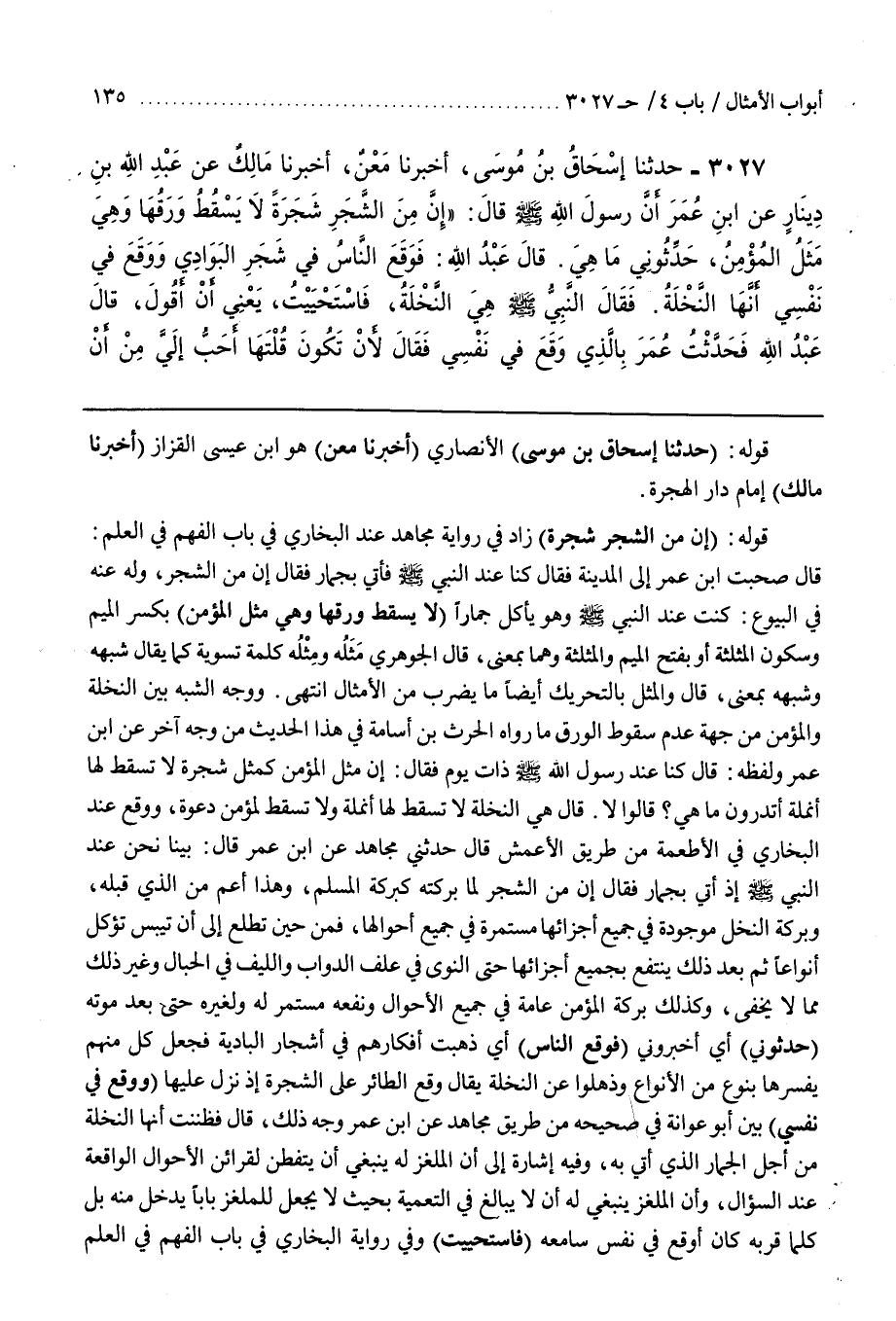 قَوْلُهُ (إِنَّ مِنَ الشَّجَرِ شَجَرَةً) زَادَ فِي رِوَايَةِ مُجَاهِدٍ عِنْدَ الْبُخَارِيِّ فِي بَابِ الْفَهْمِ في العلم قال صحبت بن عُمَرَ إِلَى الْمَدِينَةِ فَقَالَ كُنَّا عِنْدَ النَّبِيِّ صَلَّى اللَّهُ عَلَيْهِ وَسَلَّمَ فَأُتِيَ بِجُمَّارٍ فَقَالَ إِنَّ مِنَ الشَّجَرِ وَلَهُ عَنْهُ فِي الْبُيُوعِ كُنْتُ عِنْدَ النَّبِيِّ صَلَّى اللَّهُ عَلَيْهِ وَسَلَّمَ وَهُوَ يَأْكُلُ جُمَّارًا (لَا يَسْقُطُ وَرَقُهَا وَهِيَ مِثْلُ الْمُؤْمِنِ) بِكَسْرِ الْمِيمِ وَسُكُونِ الْمُثَلَّثَةِ أَوْ بفتح الميم والمثلثة وهما بمعنى قال الجوهر مِثْلُهُ وَمَثَلُهُ كَلِمَةُ تَسْوِيَةٍ كَمَا يُقَالُ شِبْهُهُ وَشَبَهُهُ بِمَعْنًى قَالَ وَالْمَثَلُ بِالتَّحْرِيكِ أَيْضًا مَا يُضْرَبُ مِنَ الْأَمْثَالِ انْتَهَى